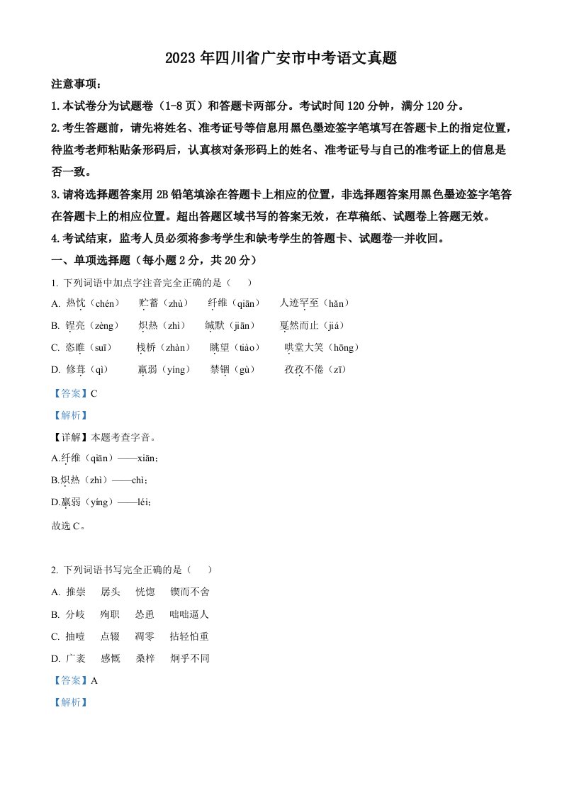 2023年四川省广安市中考语文真题(含答案)_共23页