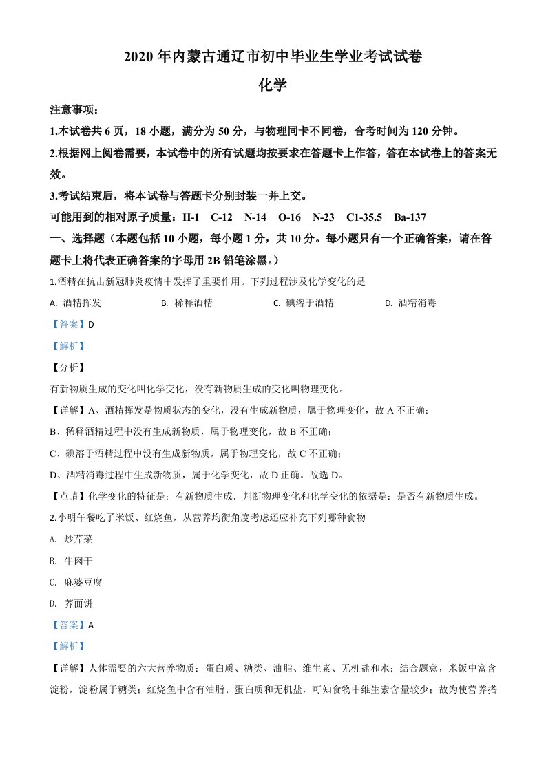 内蒙古通辽市2020年中考化学试题(含答案)_共15页