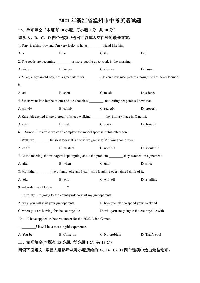 当前位置: 首页初中资源中考真题正文 浙江省温州市2021年中考英语试题(空白卷)_共10页 中考真题 2 周前 0 0 5 以上为部分内容预览,如需源文档请登录您的会员账号进行下载! 声明:本站所有文章,如无特殊说明或标注,均为本站原创发布。任何个人或组织,在未征得本站同意时,禁止复制、盗用、采集、发布本站内容到任何网站、书籍等各类媒体平台。如若本站内容侵犯了原著者的合法权益,可联系我们进行处理。 尚学资源永久会员 打赏 收藏 海报 链接
