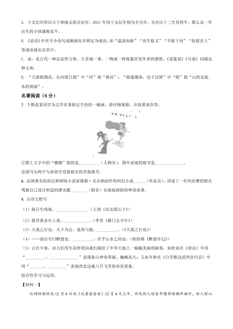 湖南省怀化市2021年中考语文试题(空白卷)_共9页