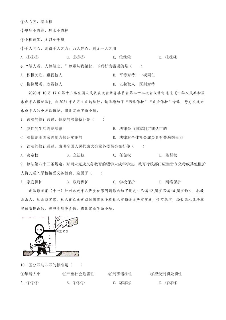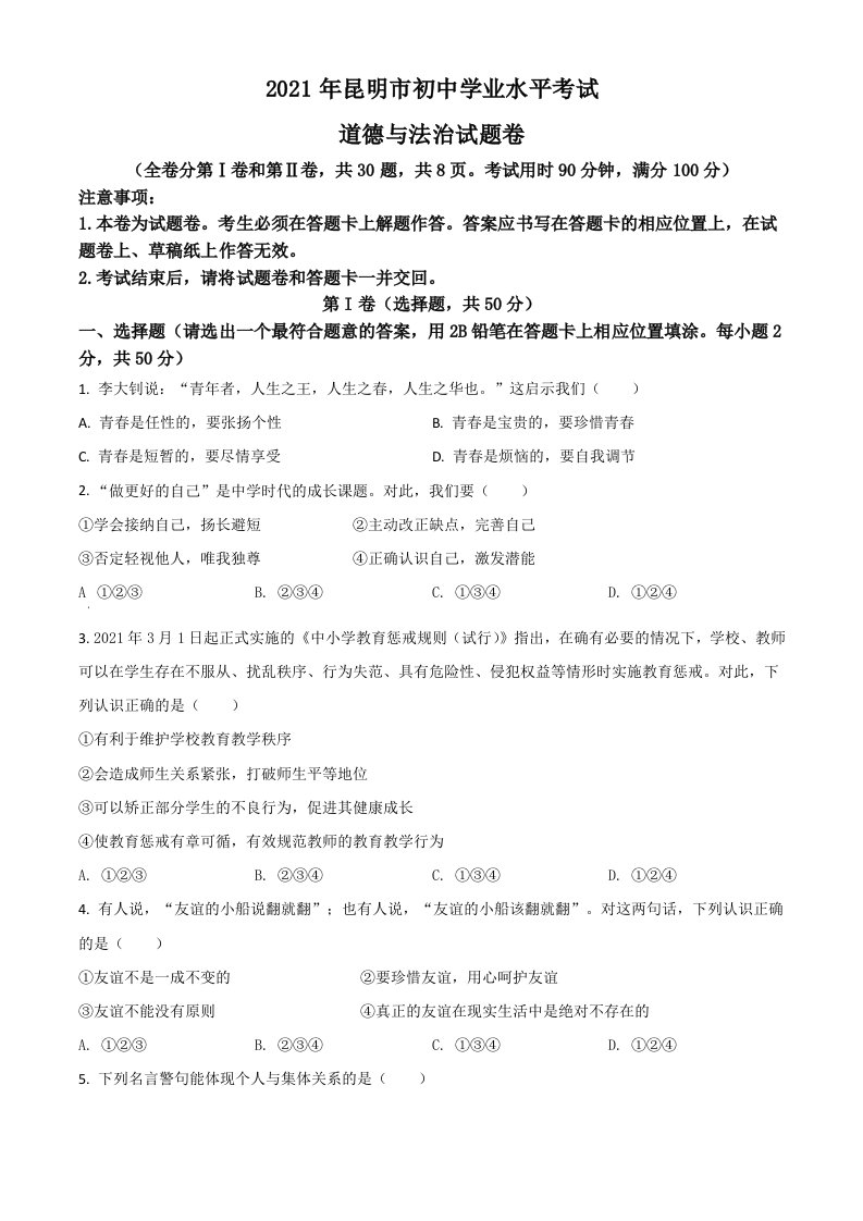 云南省昆明市2021年中考道德与法治试题(空白卷)_共9页