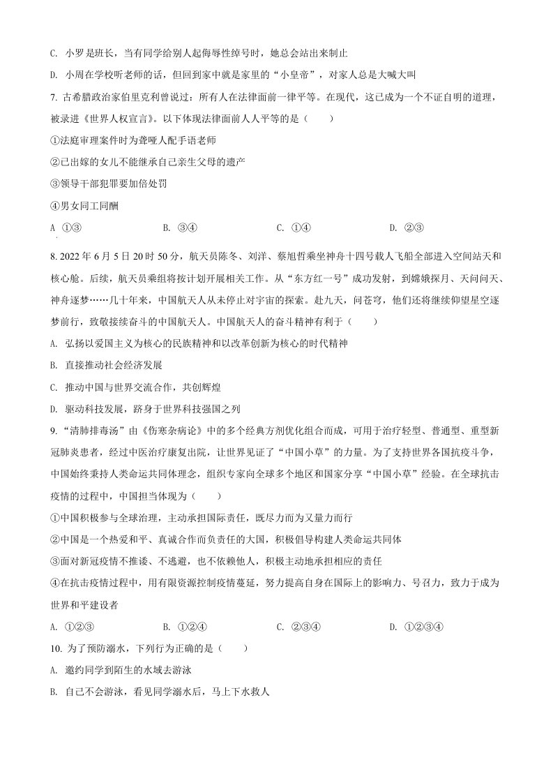 2022年湖南省张家界市中考道德与法治真题(空白卷)_共6页