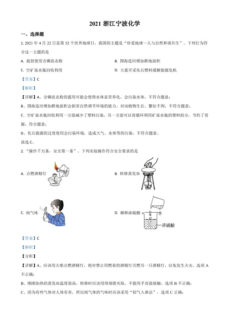 浙江省宁波市2021年中考化学试题(含答案)_共10页