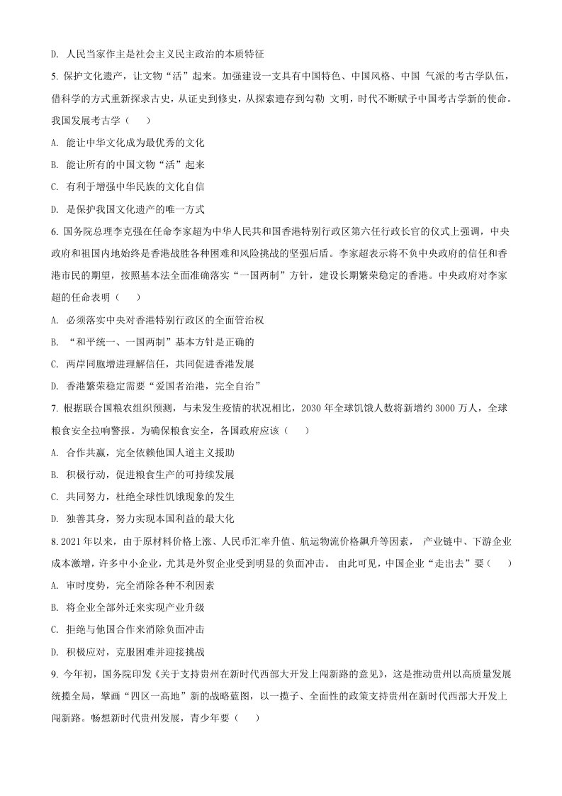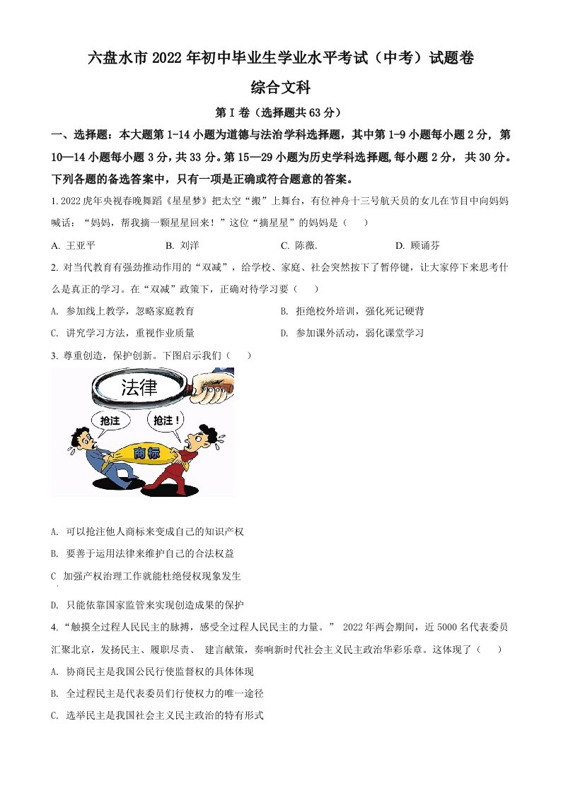 2022年贵州省六盘水市中考道德与法治真题(空白卷)_共7页