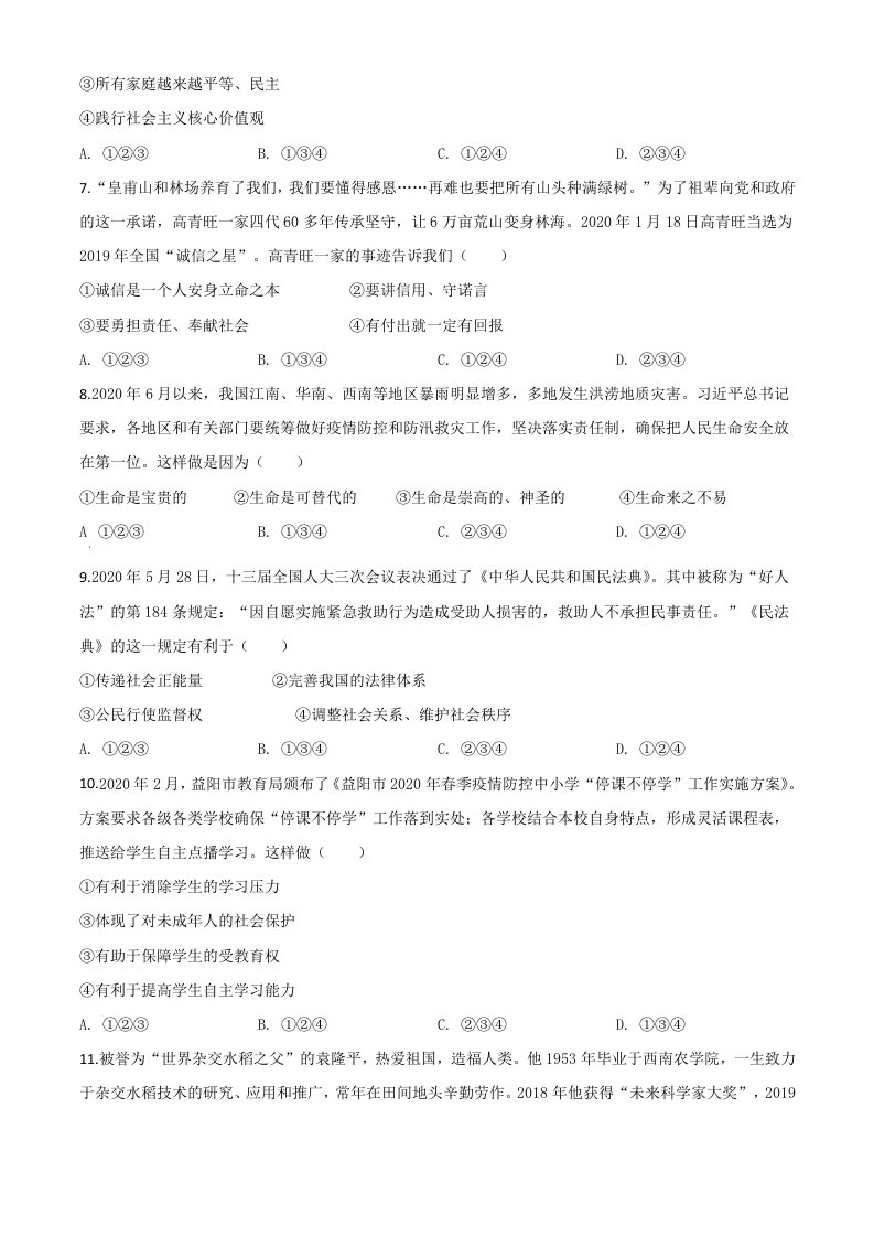 湖南省益阳市2020年中考道德与法治试题(空白卷)_共7页