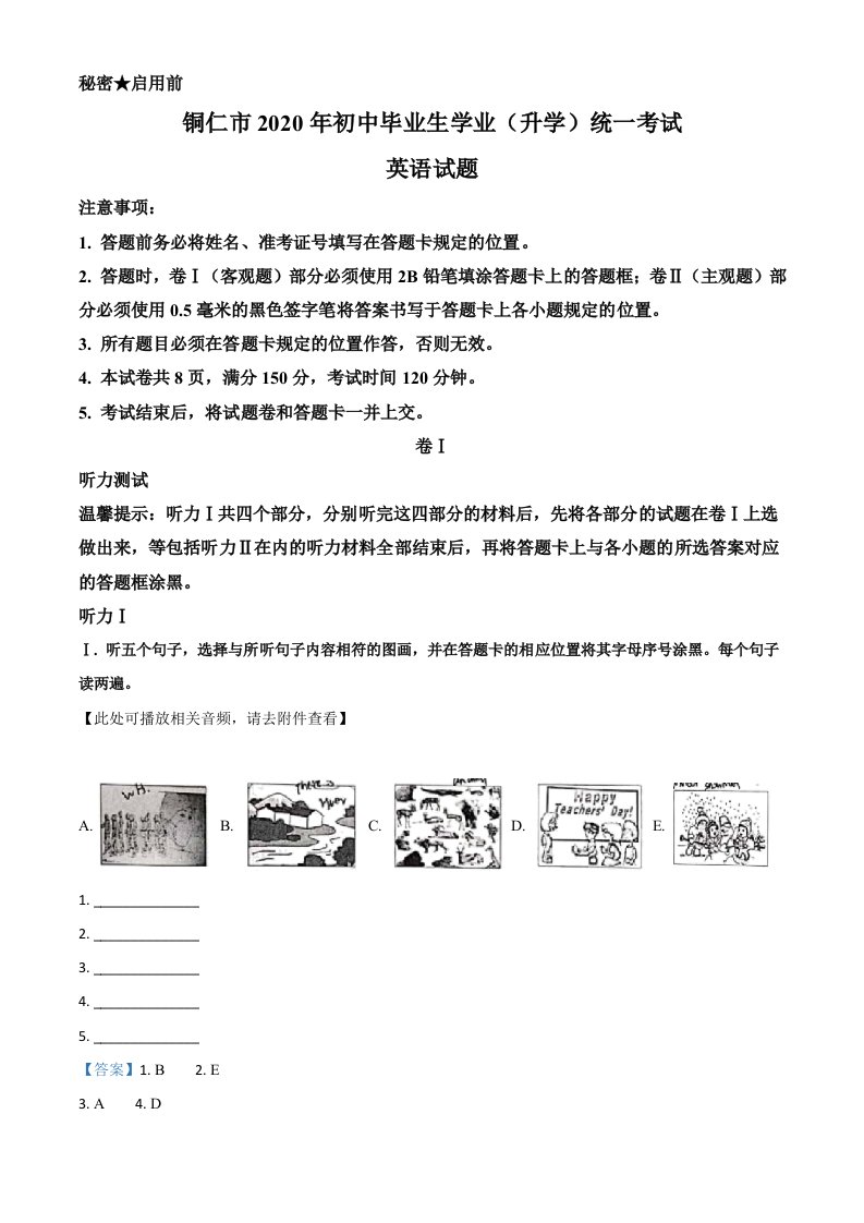 贵州省铜仁市2020年中考英语试题(含听力)(含答案)_共27页