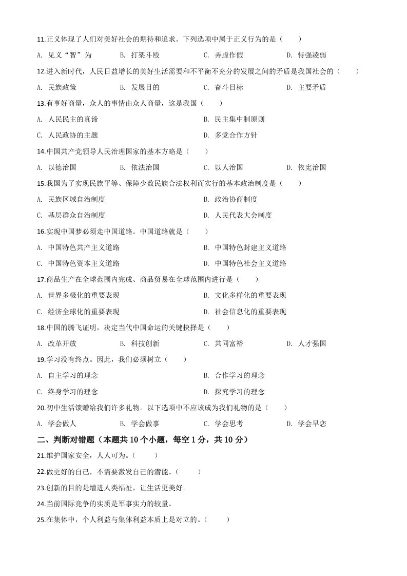 当前位置: 首页初中资源中考真题正文 黑龙江省绥化市2020年中考道德与法治试题(空白卷)_共5页 中考真题 2 周前 0 0 5 以上为部分内容预览,如需源文档请登录您的会员账号进行下载! 声明:本站所有文章,如无特殊说明或标注,均为本站原创发布。任何个人或组织,在未征得本站同意时,禁止复制、盗用、采集、发布本站内容到任何网站、书籍等各类媒体平台。如若本站内容侵犯了原著者的合法权益,可联系我们进行处理。 尚学资源永久会员 打赏 收藏 海报 链接
