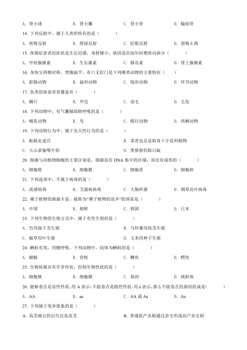 2022年黑龙江省绥化市中考生物真题(空白卷)(1)_共6页