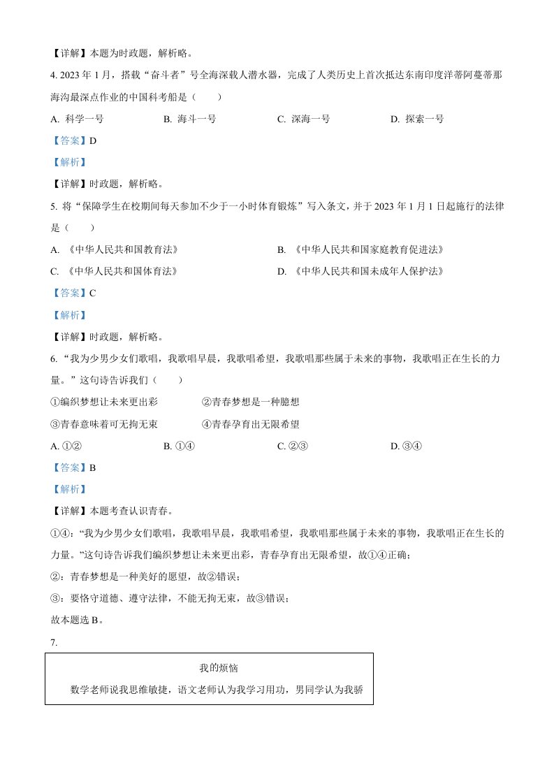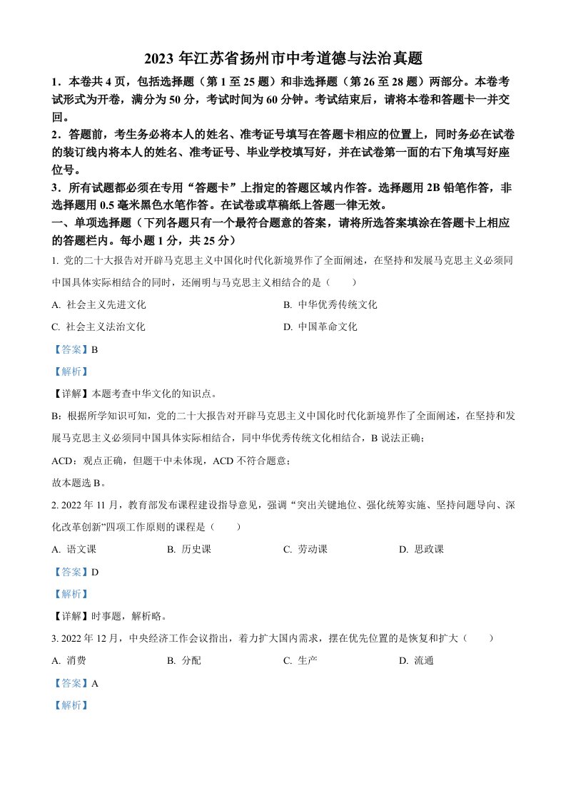 2023年江苏省扬州市中考道德与法治真题(含答案)_共18页