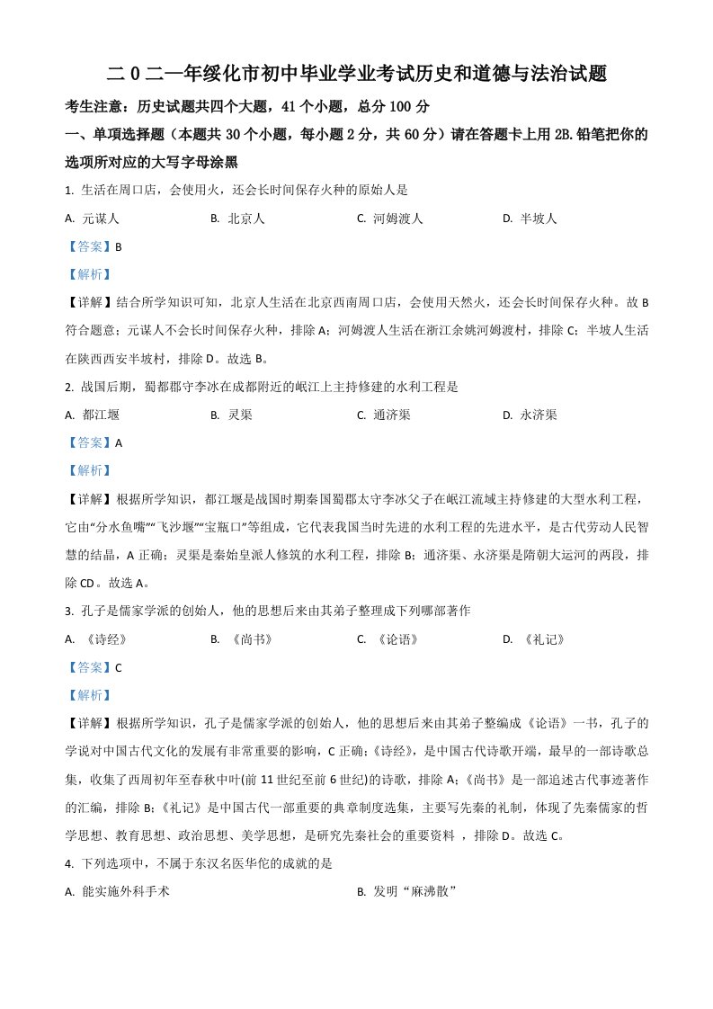 黑龙江省绥化市2021年中考历史试题(含答案)_共16页