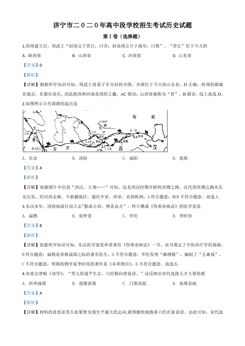 山东省济宁市2020年中考历史试题(含答案)_共12页