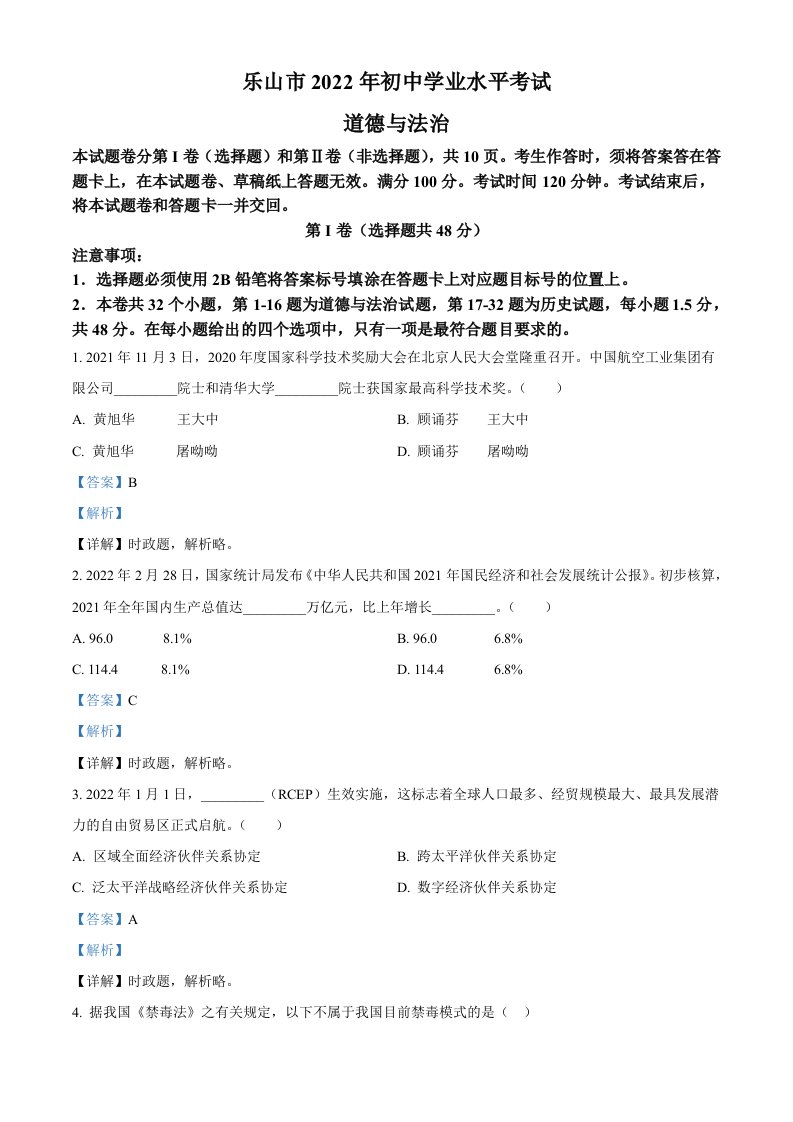 2022年四川省乐山市中考道德与法治真题(含答案)_共14页