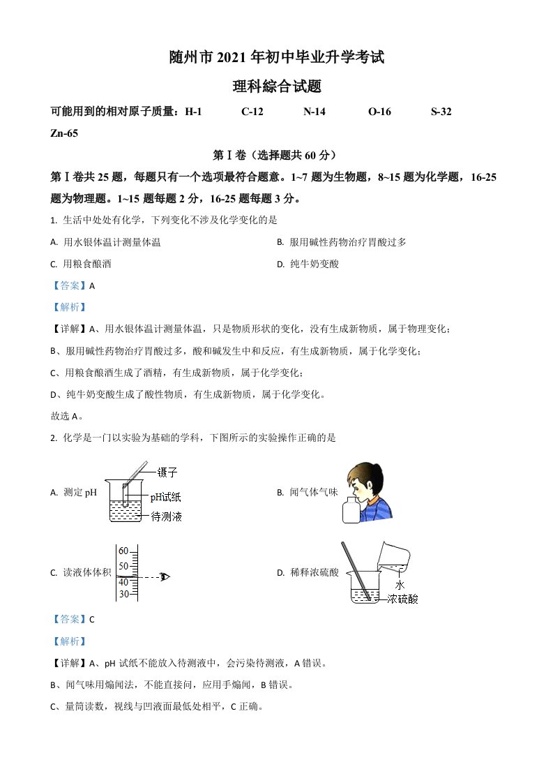湖北省随州市2021年中考化学试题(含答案)_共14页