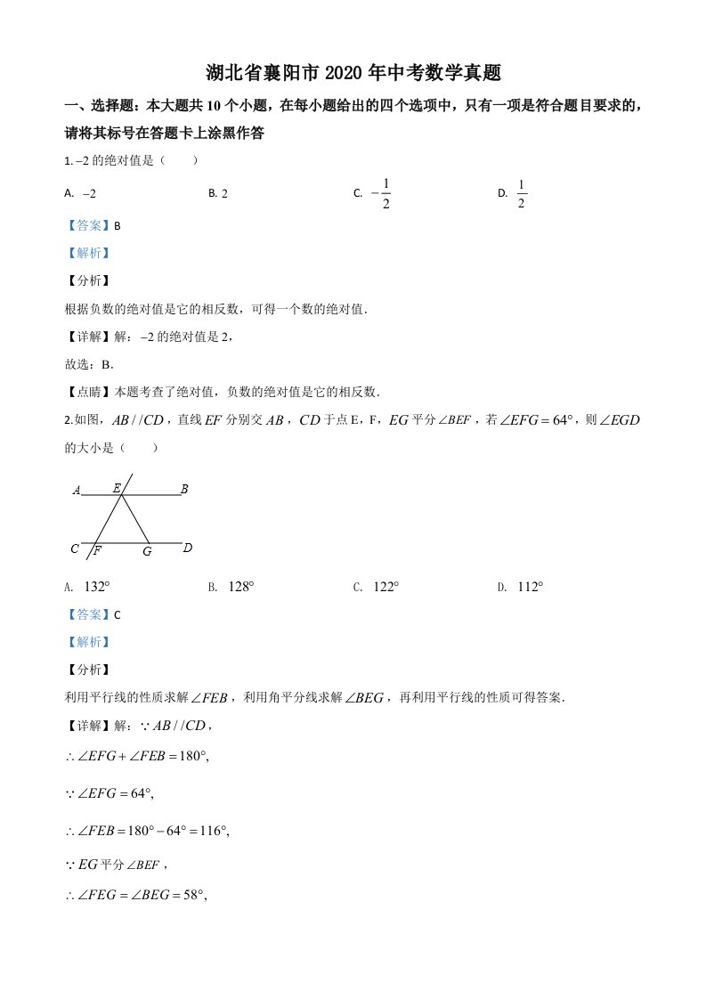 湖北省襄阳市2020年中考数学试题(含答案)_共29页