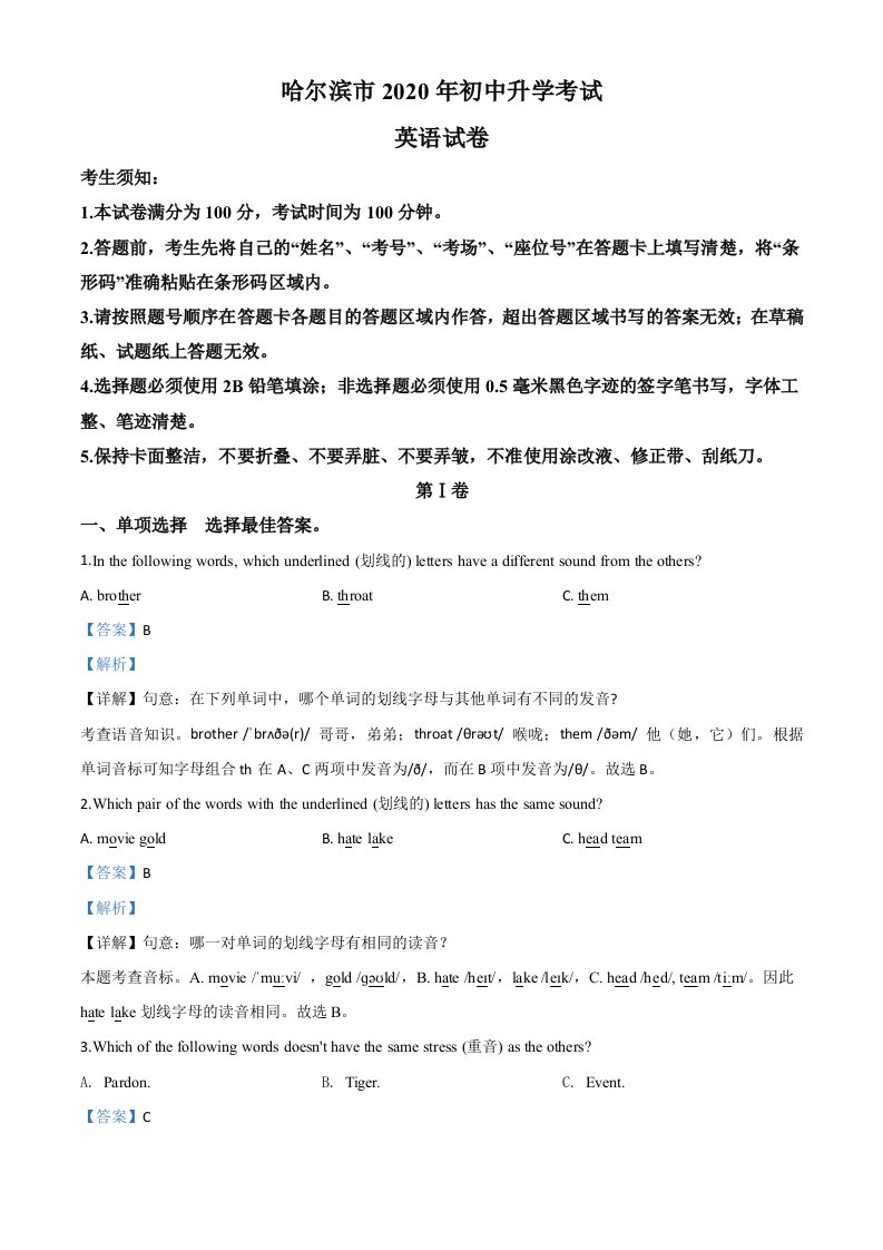 当前位置: 首页初中资源中考真题正文 黑龙江省哈尔滨市2020年中考英语试题(含答案)_共26页 中考真题 2 周前 0 0 15 以上为部分内容预览,如需源文档请登录您的会员账号进行下载! 声明:本站所有文章,如无特殊说明或标注,均为本站原创发布。任何个人或组织,在未征得本站同意时,禁止复制、盗用、采集、发布本站内容到任何网站、书籍等各类媒体平台。如若本站内容侵犯了原著者的合法权益,可联系我们进行处理。 尚学资源永久会员 打赏 收藏 海报 链接