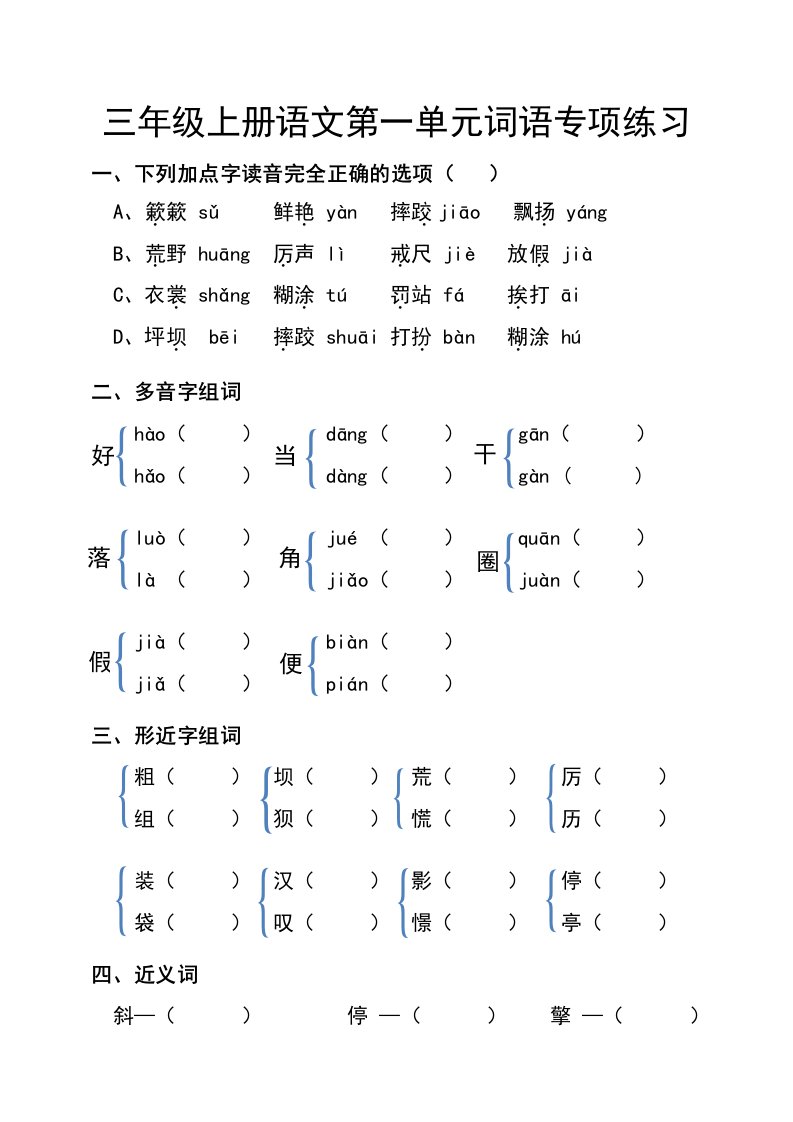 当前位置: 首页小学资源小学三年级正文 三年级上册语文第一单元词语专项练习_共4页 小学三年级 2 周前 0 0 5 以上为部分内容预览,如需源文档请登录您的会员账号进行下载! 声明:本站所有文章,如无特殊说明或标注,均为本站原创发布。任何个人或组织,在未征得本站同意时,禁止复制、盗用、采集、发布本站内容到任何网站、书籍等各类媒体平台。如若本站内容侵犯了原著者的合法权益,可联系我们进行处理。 尚学资源永久会员 打赏 收藏 海报 链接