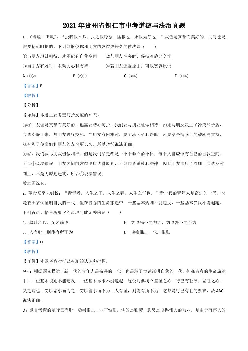 贵州省铜仁市2021年中考道德与法治真题(含答案)_共12页