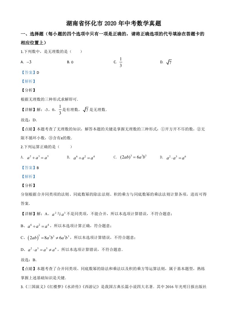 湖南省怀化市2020年中考数学真题(含答案)_共23页