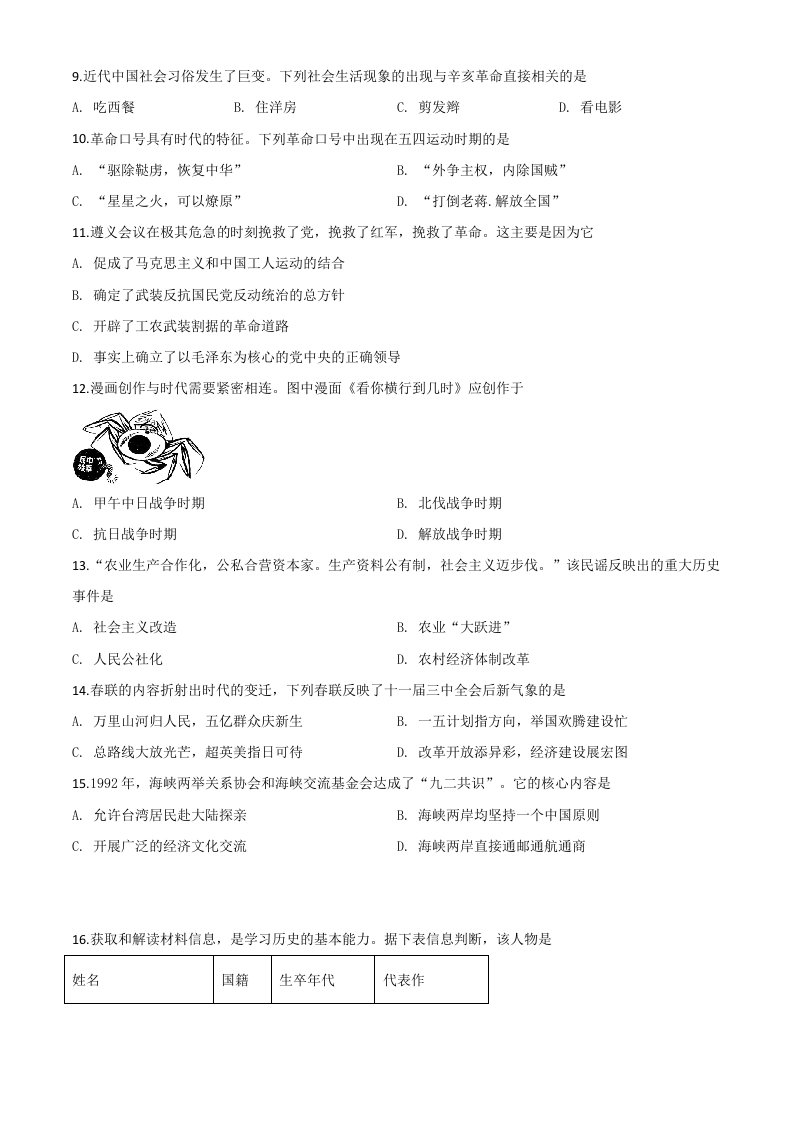 山东省济宁市2020年中考历史试题(空白卷)_共7页