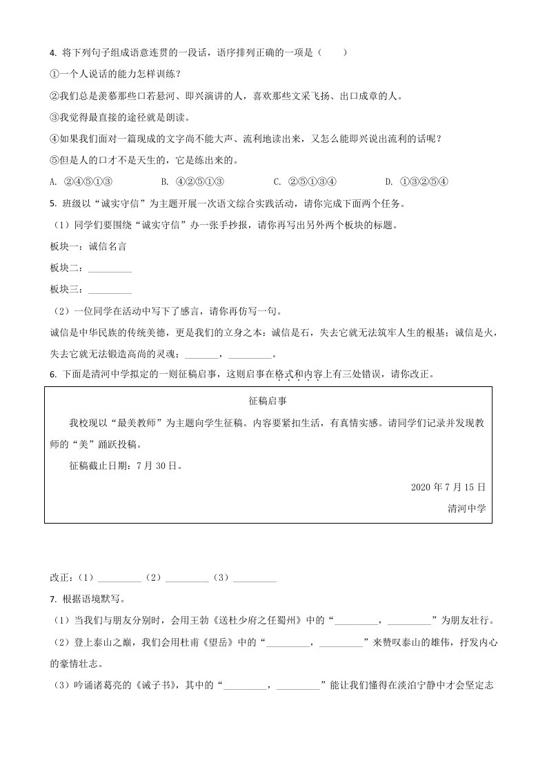 当前位置: 首页初中资源中考真题正文 内蒙古赤峰市2020年中考语文试题(空白卷)_共11页 中考真题 2 周前 0 0 10 以上为部分内容预览,如需源文档请登录您的会员账号进行下载! 声明:本站所有文章,如无特殊说明或标注,均为本站原创发布。任何个人或组织,在未征得本站同意时,禁止复制、盗用、采集、发布本站内容到任何网站、书籍等各类媒体平台。如若本站内容侵犯了原著者的合法权益,可联系我们进行处理。 尚学资源永久会员 打赏 收藏 海报 链接