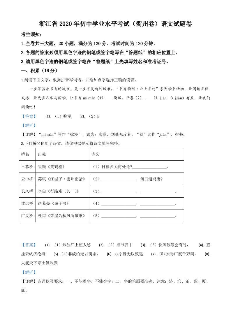 当前位置: 首页初中资源中考真题正文 浙江省衢州市2020年中考语文试题(含答案)_共18页 中考真题 2 周前 0 0 10 以上为部分内容预览,如需源文档请登录您的会员账号进行下载! 声明:本站所有文章,如无特殊说明或标注,均为本站原创发布。任何个人或组织,在未征得本站同意时,禁止复制、盗用、采集、发布本站内容到任何网站、书籍等各类媒体平台。如若本站内容侵犯了原著者的合法权益,可联系我们进行处理。 尚学资源永久会员 打赏 收藏 海报 链接