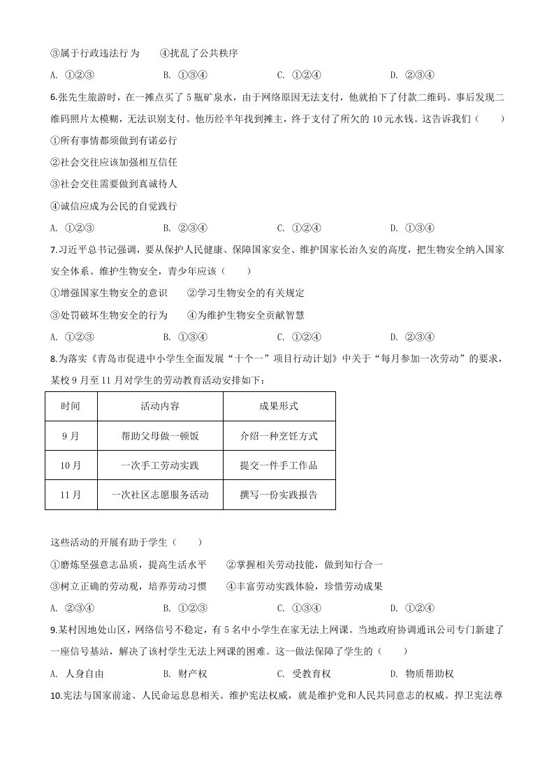 山东省青岛市2020年中考道德与法治试题(空白卷)_共10页