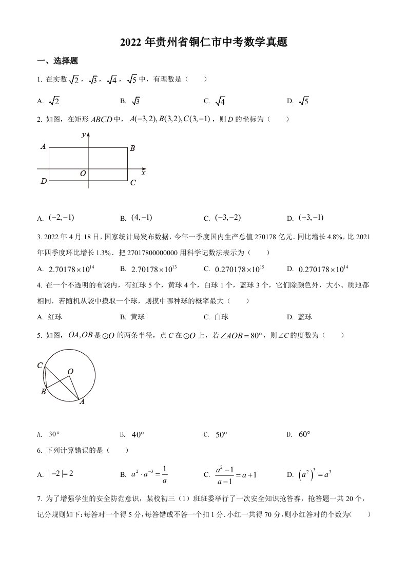 2022年贵州省铜仁市中考数学真题(空白卷)_共7页