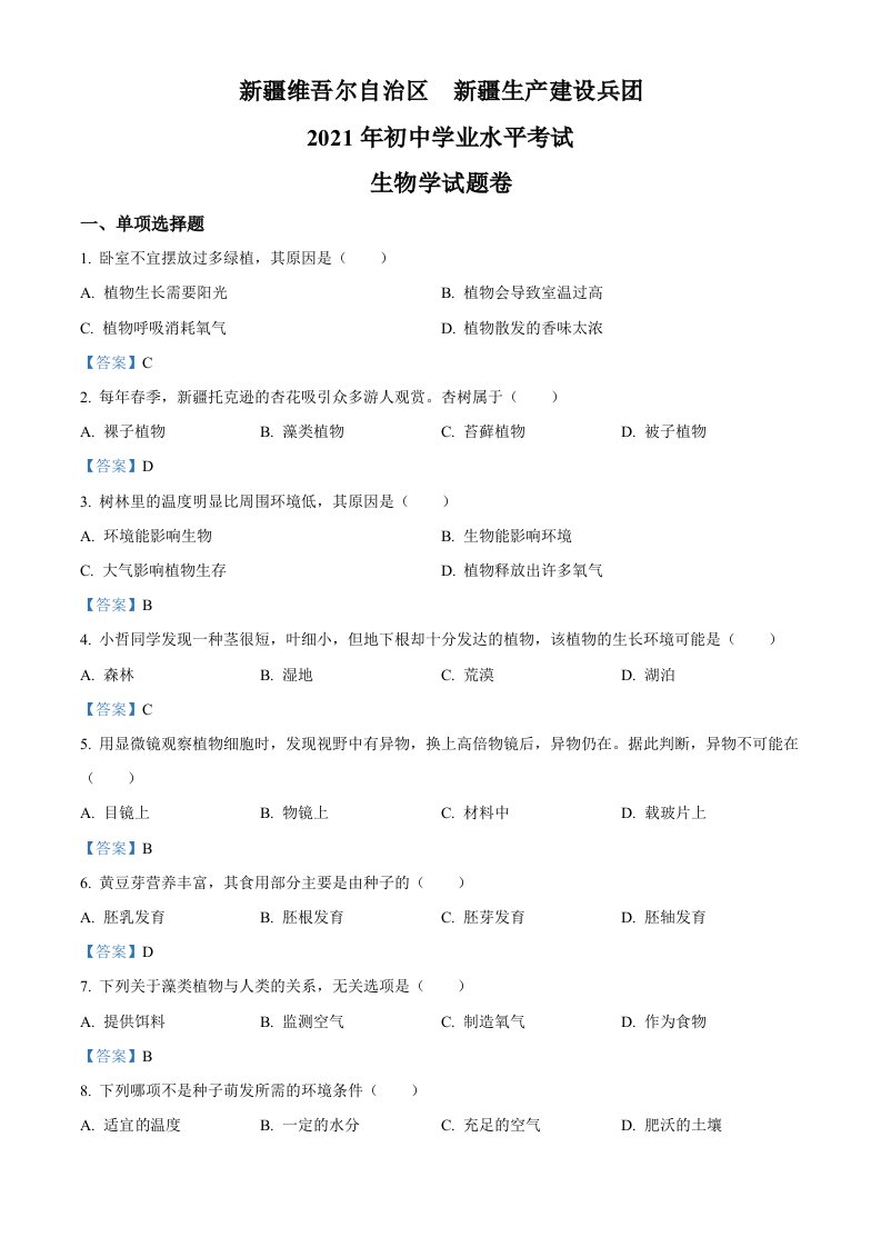 当前位置: 首页初中资源中考真题正文 2021年新疆中考生物试卷_共9页 中考真题 2 周前 0 0 10 以上为部分内容预览,如需源文档请登录您的会员账号进行下载! 声明:本站所有文章,如无特殊说明或标注,均为本站原创发布。任何个人或组织,在未征得本站同意时,禁止复制、盗用、采集、发布本站内容到任何网站、书籍等各类媒体平台。如若本站内容侵犯了原著者的合法权益,可联系我们进行处理。 尚学资源永久会员 打赏 收藏 海报 链接