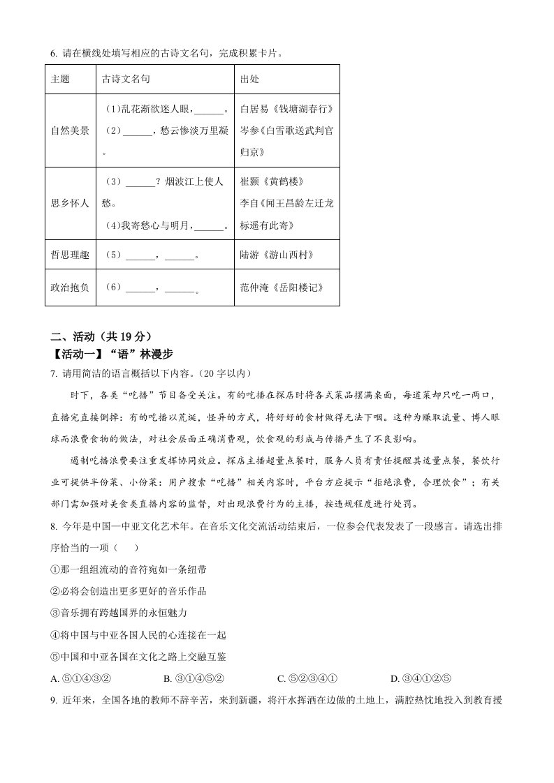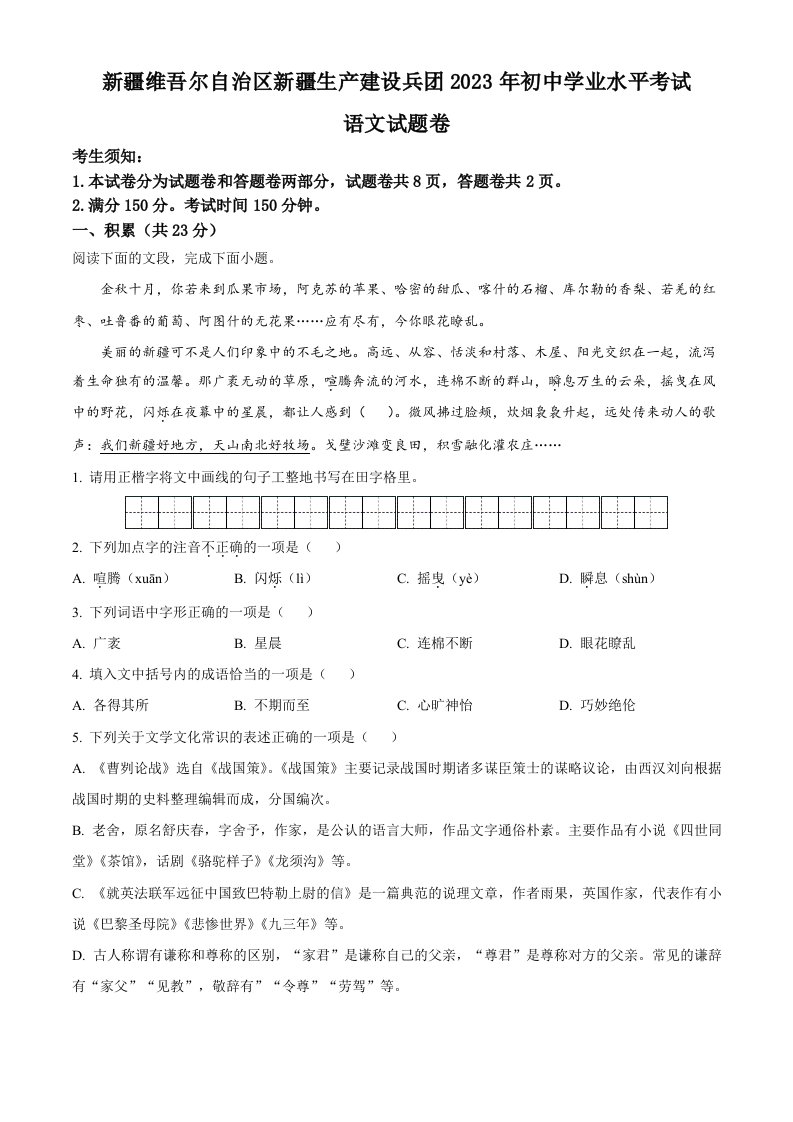 2023年新疆维吾尔自治区、新疆生产建设兵团中考语文真题(空白卷)_共9页