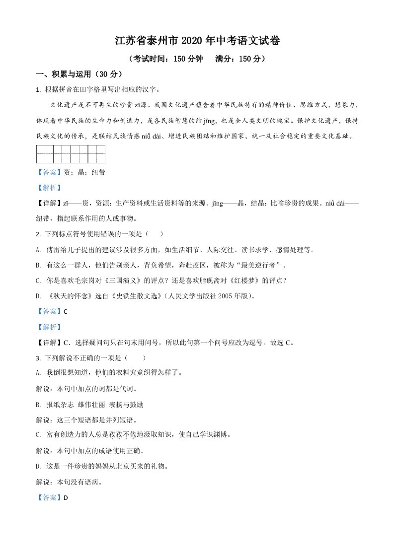 当前位置: 首页初中资源中考真题正文 江苏省泰州市2020年中考语文试题(含答案)_共15页 中考真题 1 周前 0 0 5 以上为部分内容预览,如需源文档请登录您的会员账号进行下载! 声明:本站所有文章,如无特殊说明或标注,均为本站原创发布。任何个人或组织,在未征得本站同意时,禁止复制、盗用、采集、发布本站内容到任何网站、书籍等各类媒体平台。如若本站内容侵犯了原著者的合法权益,可联系我们进行处理。 尚学资源永久会员 打赏 收藏 海报 链接