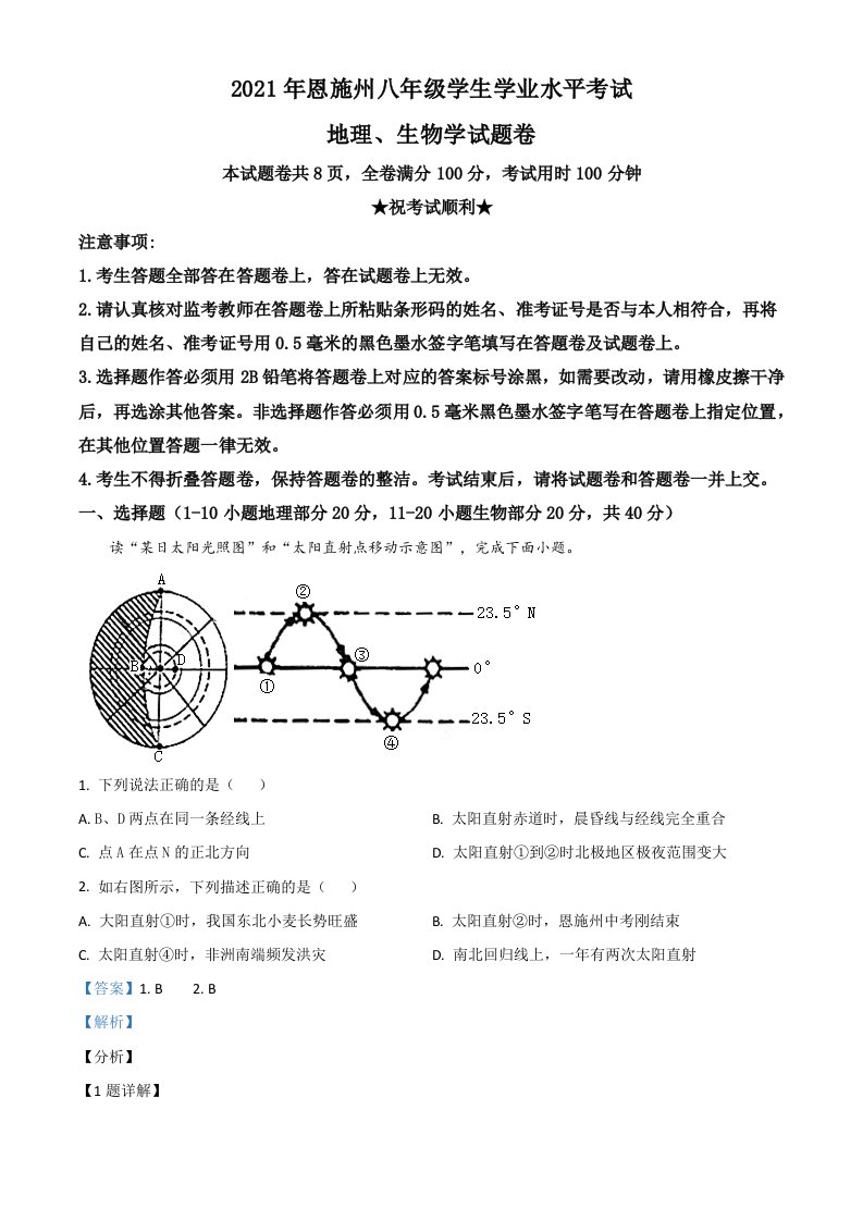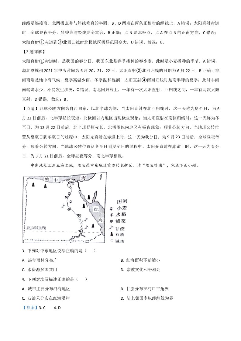 湖北省恩施土家族苗族自治州2021年中考地理生物真题(地理部分)(含答案)_共12页
