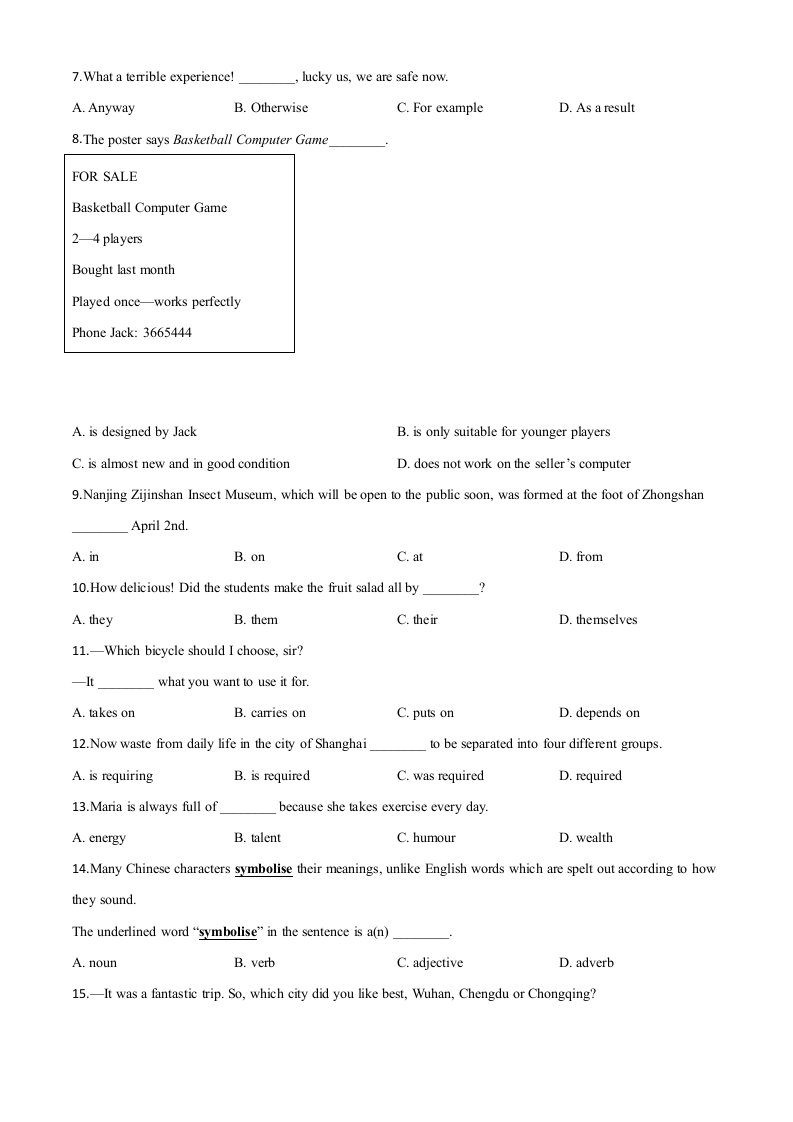 当前位置: 首页初中资源中考真题正文 江苏省南京市2020年中考英语试题(空白卷)_共14页 中考真题 1 周前 0 0 5 以上为部分内容预览,如需源文档请登录您的会员账号进行下载! 声明:本站所有文章,如无特殊说明或标注,均为本站原创发布。任何个人或组织,在未征得本站同意时,禁止复制、盗用、采集、发布本站内容到任何网站、书籍等各类媒体平台。如若本站内容侵犯了原著者的合法权益,可联系我们进行处理。 尚学资源永久会员 打赏 收藏 海报 链接