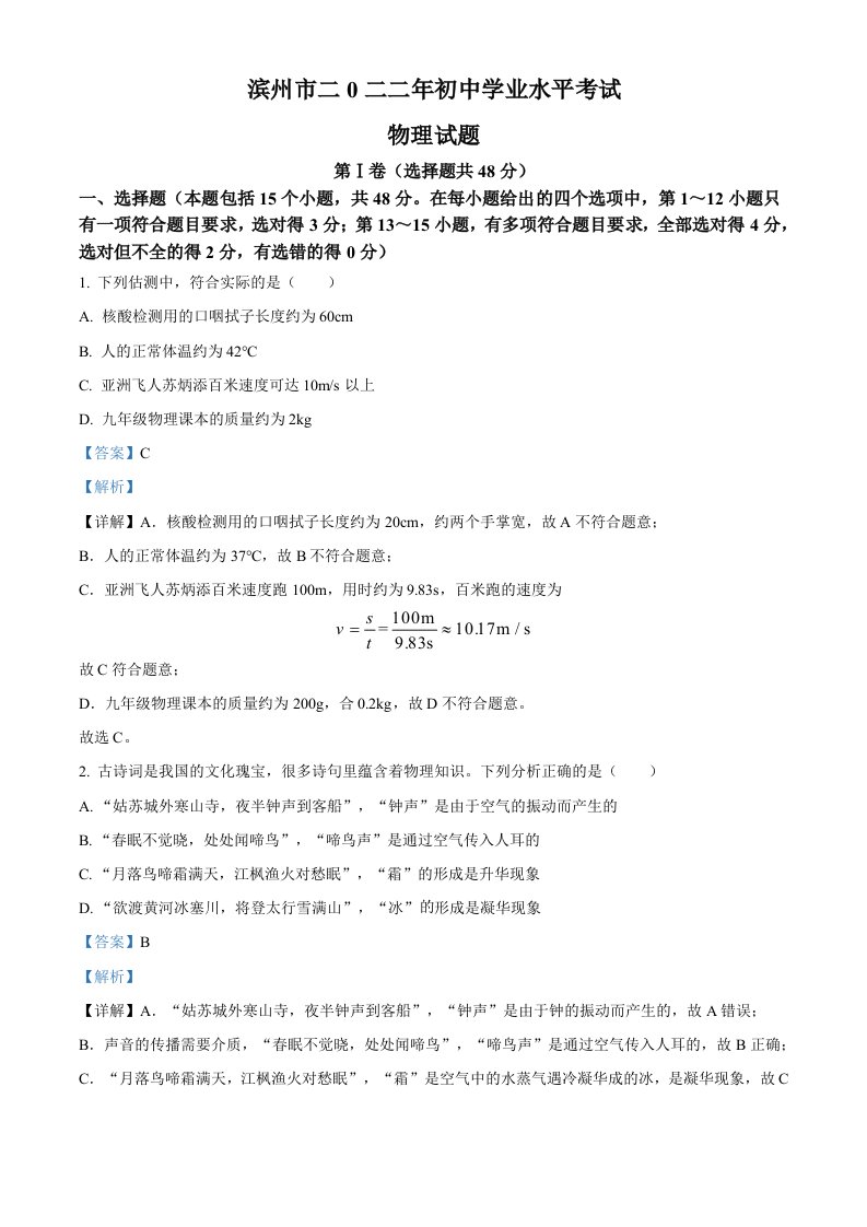 2022年山东省滨州市中考物理试题(含答案)_共22页