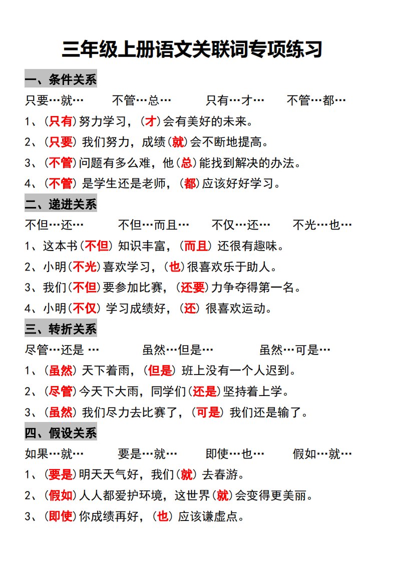 当前位置: 首页小学资源小学三年级正文 三年级上册语文关联词专项练习_共3页 小学三年级 1 周前 0 0 5 以上为部分内容预览,如需源文档请登录您的会员账号进行下载! 声明:本站所有文章,如无特殊说明或标注,均为本站原创发布。任何个人或组织,在未征得本站同意时,禁止复制、盗用、采集、发布本站内容到任何网站、书籍等各类媒体平台。如若本站内容侵犯了原著者的合法权益,可联系我们进行处理。 尚学资源永久会员 打赏 收藏 海报 链接