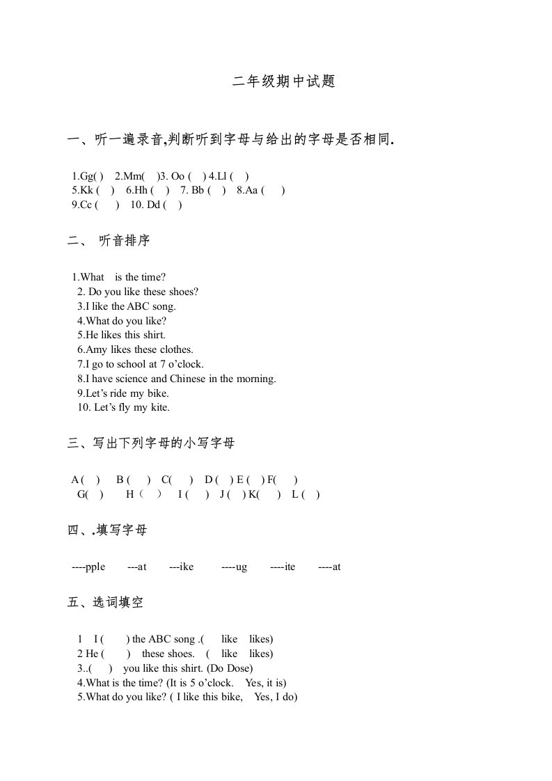 二年级英语上册期中练习(人教版一起点)_共2页