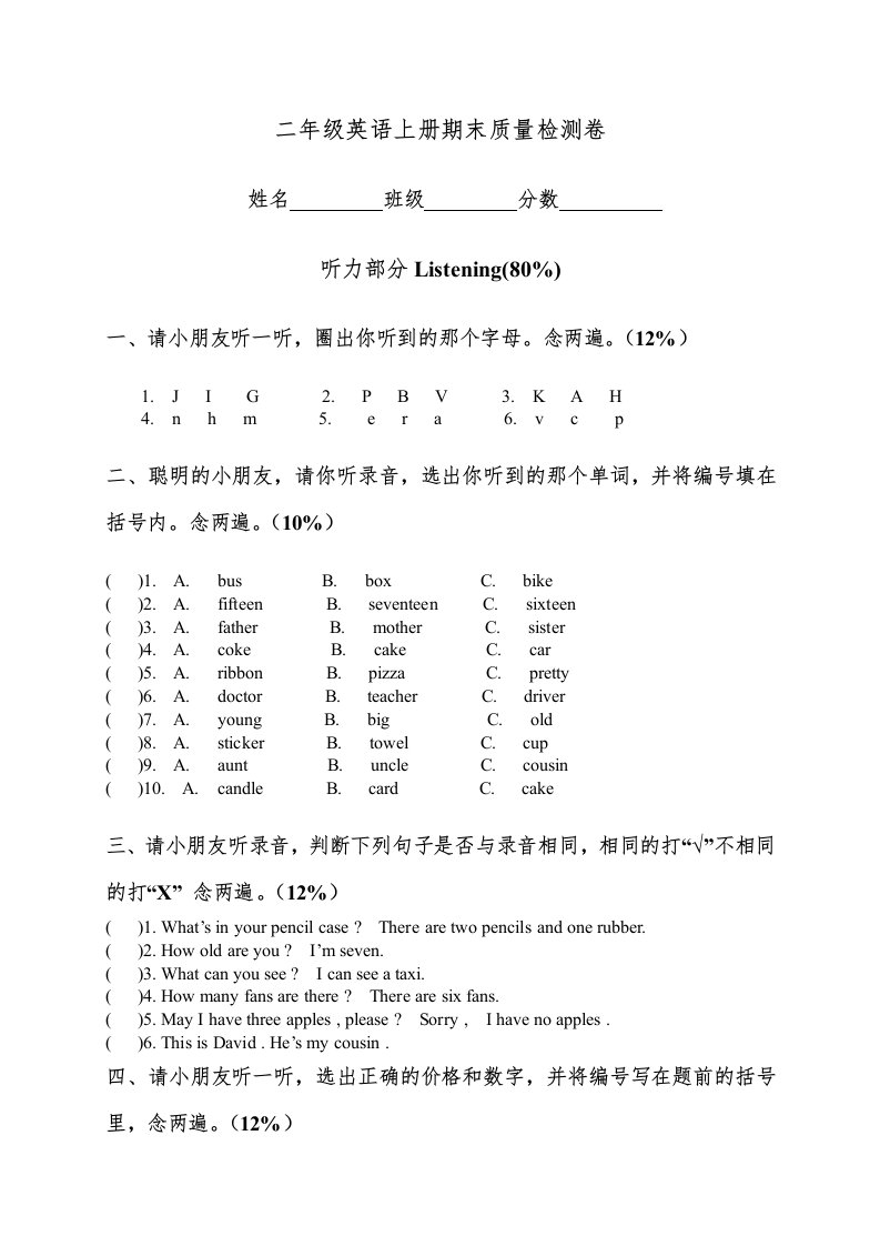 二年级英语上册期末质量检测卷(1)(人教版一起点)_共7页