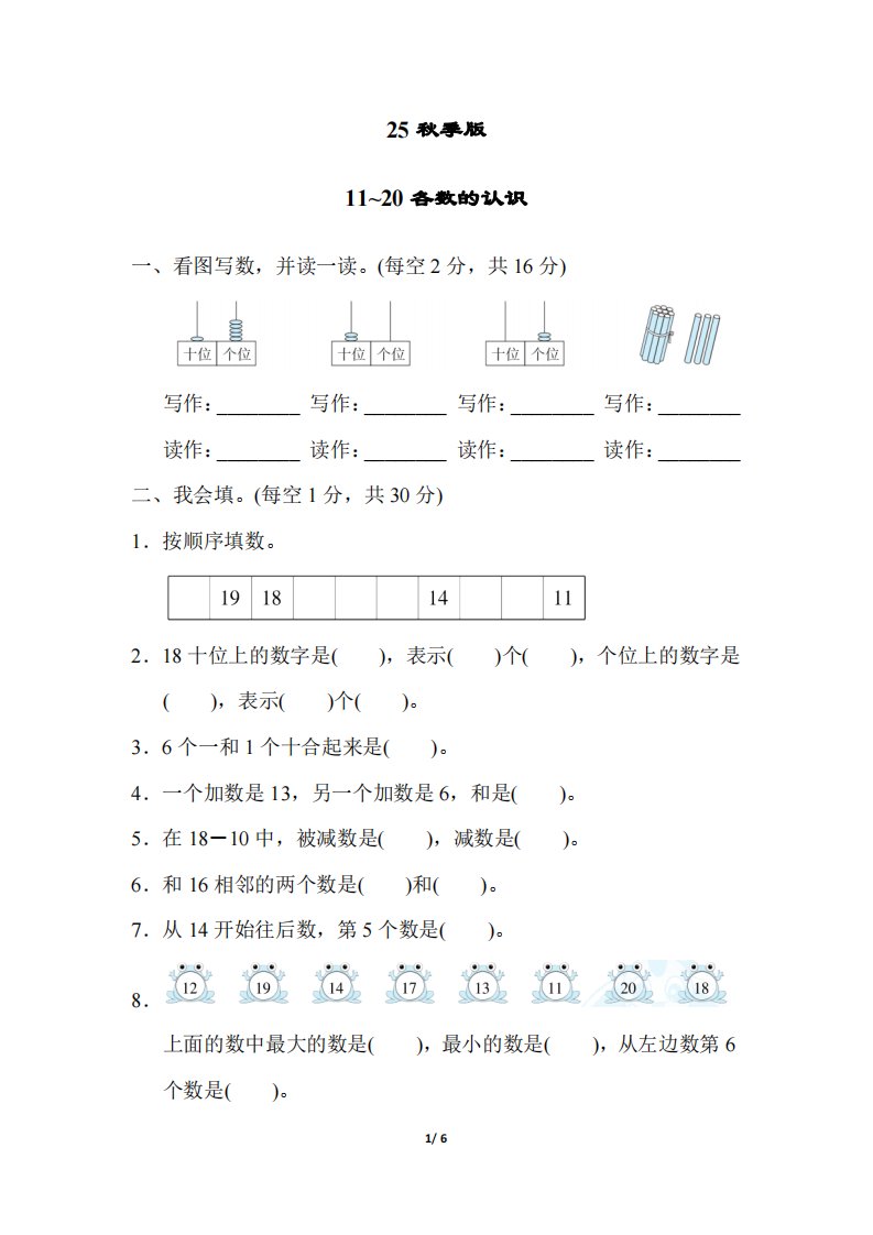 当前位置: 首页小学资源小学一年级正文 【2025秋新版】一年级上册数学专项测试卷:11~20各数的认识附答案_共6页 小学一年级 2 周前 0 0 5 以上为部分内容预览,如需源文档请登录您的会员账号进行下载! 声明:本站所有文章,如无特殊说明或标注,均为本站原创发布。任何个人或组织,在未征得本站同意时,禁止复制、盗用、采集、发布本站内容到任何网站、书籍等各类媒体平台。如若本站内容侵犯了原著者的合法权益,可联系我们进行处理。 尚学资源永久会员 打赏 收藏 海报 链接