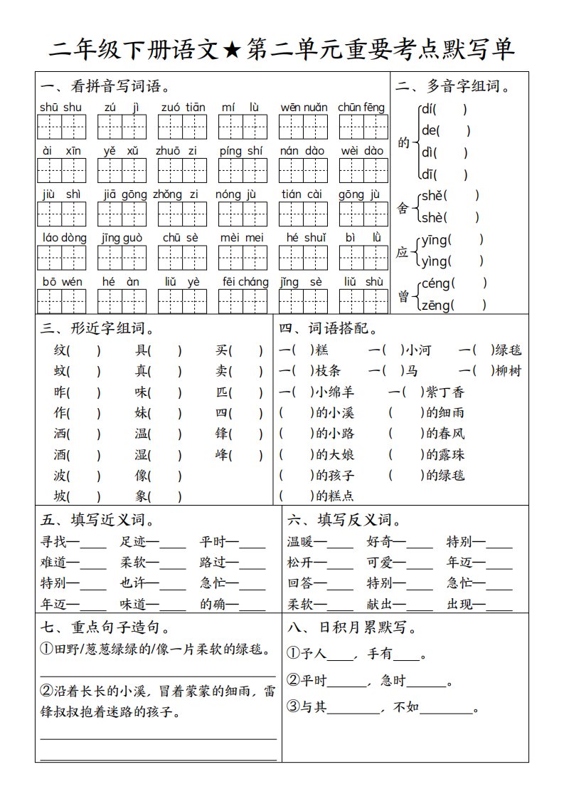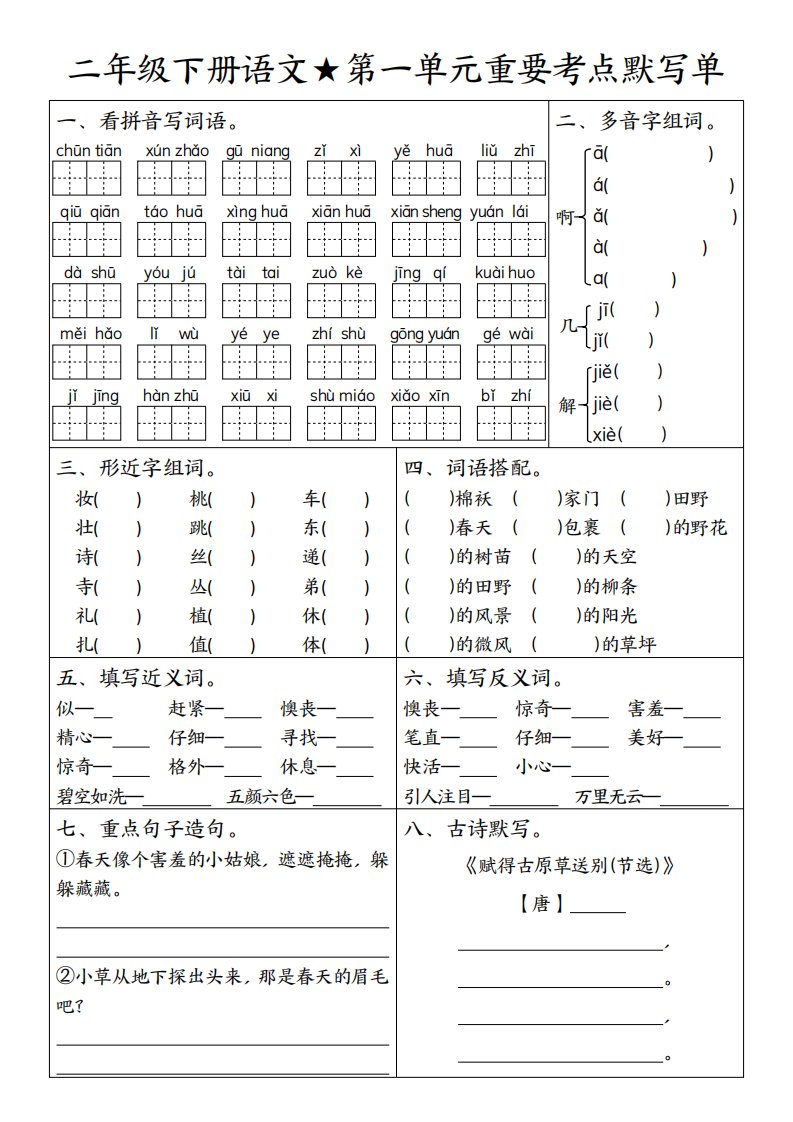 当前位置: 首页小学资源小学二年级正文 二下语文期末复习1-8单元重要考点默写单(空白+答案16页)_共16页 小学二年级 1 周前 0 0 10 以上为部分内容预览,如需源文档请登录您的会员账号进行下载! 声明:本站所有文章,如无特殊说明或标注,均为本站原创发布。任何个人或组织,在未征得本站同意时,禁止复制、盗用、采集、发布本站内容到任何网站、书籍等各类媒体平台。如若本站内容侵犯了原著者的合法权益,可联系我们进行处理。 尚学资源永久会员 打赏 收藏 海报 链接