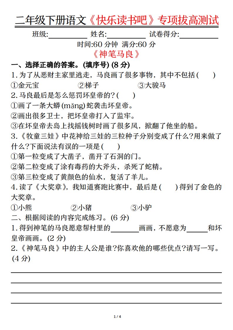 当前位置: 首页小学资源小学二年级正文 二下语文【快乐读书吧专项-空白】_共4页 小学二年级 1 周前 0 0 5 以上为部分内容预览,如需源文档请登录您的会员账号进行下载! 声明:本站所有文章,如无特殊说明或标注,均为本站原创发布。任何个人或组织,在未征得本站同意时,禁止复制、盗用、采集、发布本站内容到任何网站、书籍等各类媒体平台。如若本站内容侵犯了原著者的合法权益,可联系我们进行处理。 尚学资源永久会员 打赏 收藏 海报 链接