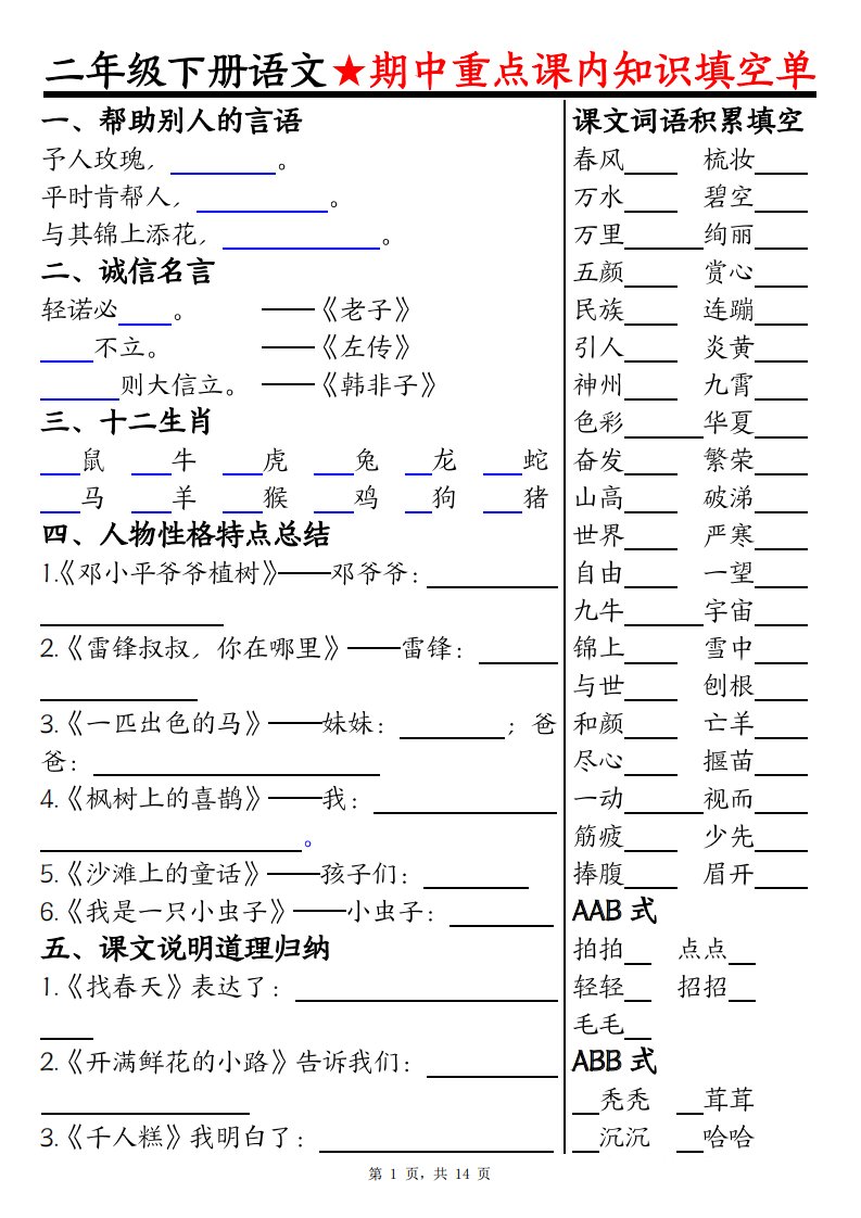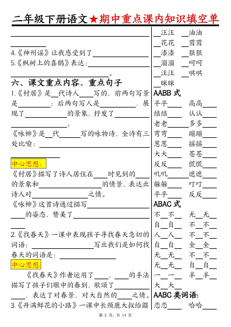 当前位置: 首页小学资源小学二年级正文 二下语文期中重点课内知识填空单(含答案14页)_共14页 小学二年级 1 周前 0 0 10 以上为部分内容预览,如需源文档请登录您的会员账号进行下载! 声明:本站所有文章,如无特殊说明或标注,均为本站原创发布。任何个人或组织,在未征得本站同意时,禁止复制、盗用、采集、发布本站内容到任何网站、书籍等各类媒体平台。如若本站内容侵犯了原著者的合法权益,可联系我们进行处理。 尚学资源永久会员 打赏 收藏 海报 链接