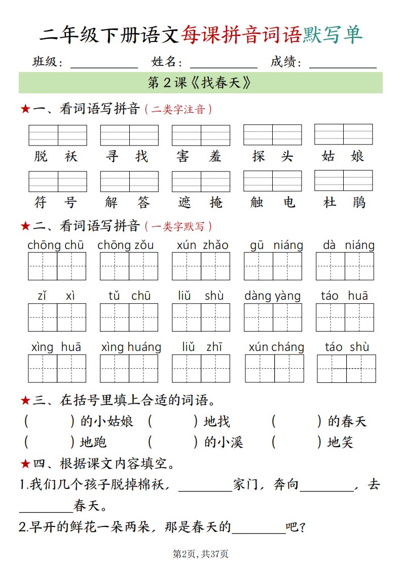 二下语文每课拼音词语默写单(完整37页)_共37页