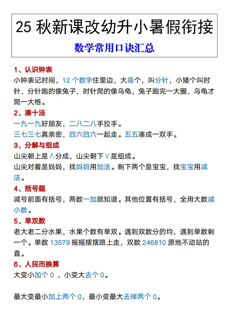 当前位置: 首页小学资源小学一年级正文 【2025秋新版】幼升小暑假衔接数学常用口诀汇总-一上数学_共2页 小学一年级 2 周前 0 0 5 以上为部分内容预览,如需源文档请登录您的会员账号进行下载! 声明:本站所有文章,如无特殊说明或标注,均为本站原创发布。任何个人或组织,在未征得本站同意时,禁止复制、盗用、采集、发布本站内容到任何网站、书籍等各类媒体平台。如若本站内容侵犯了原著者的合法权益,可联系我们进行处理。 尚学资源永久会员 打赏 收藏 海报 链接