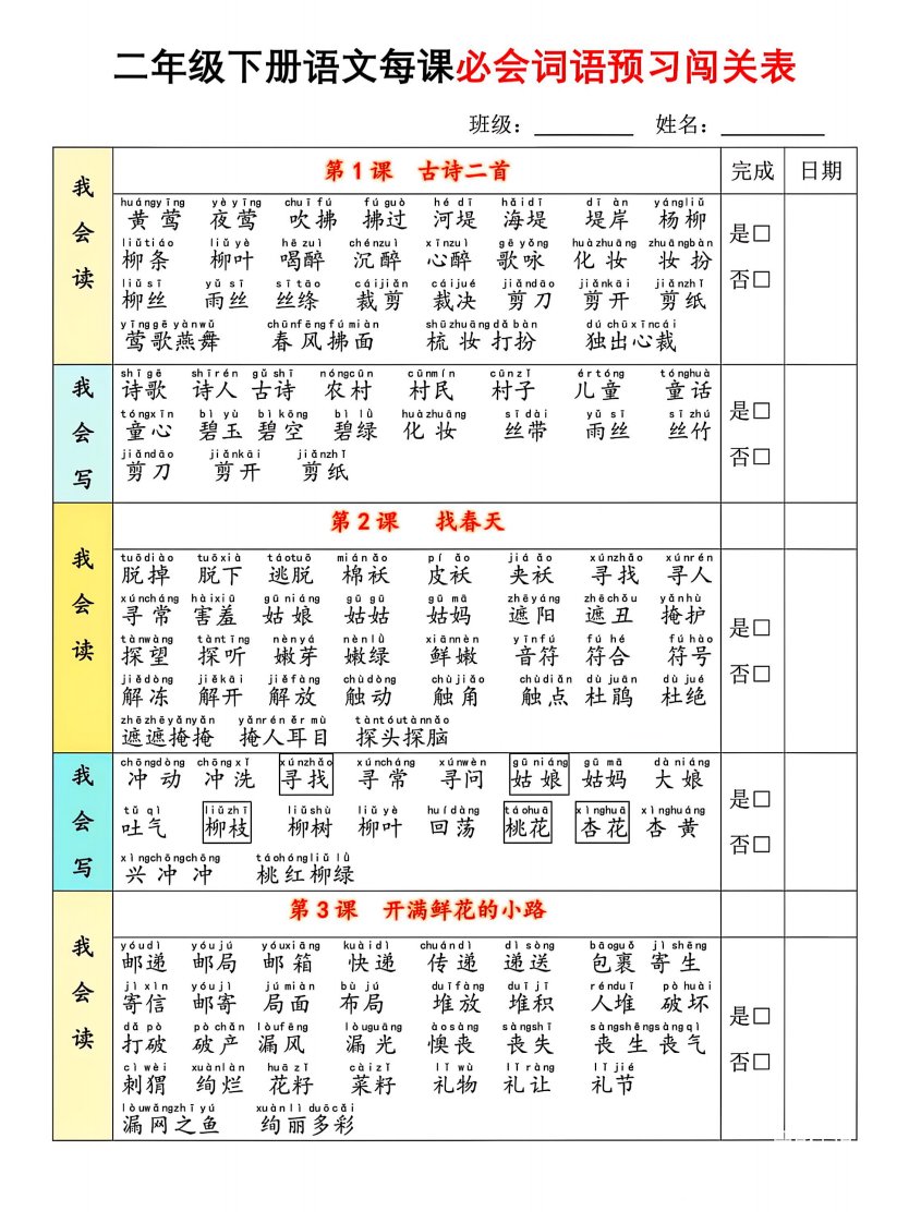 二年级下册语文每课必会词语预习闯(1)_共14页
