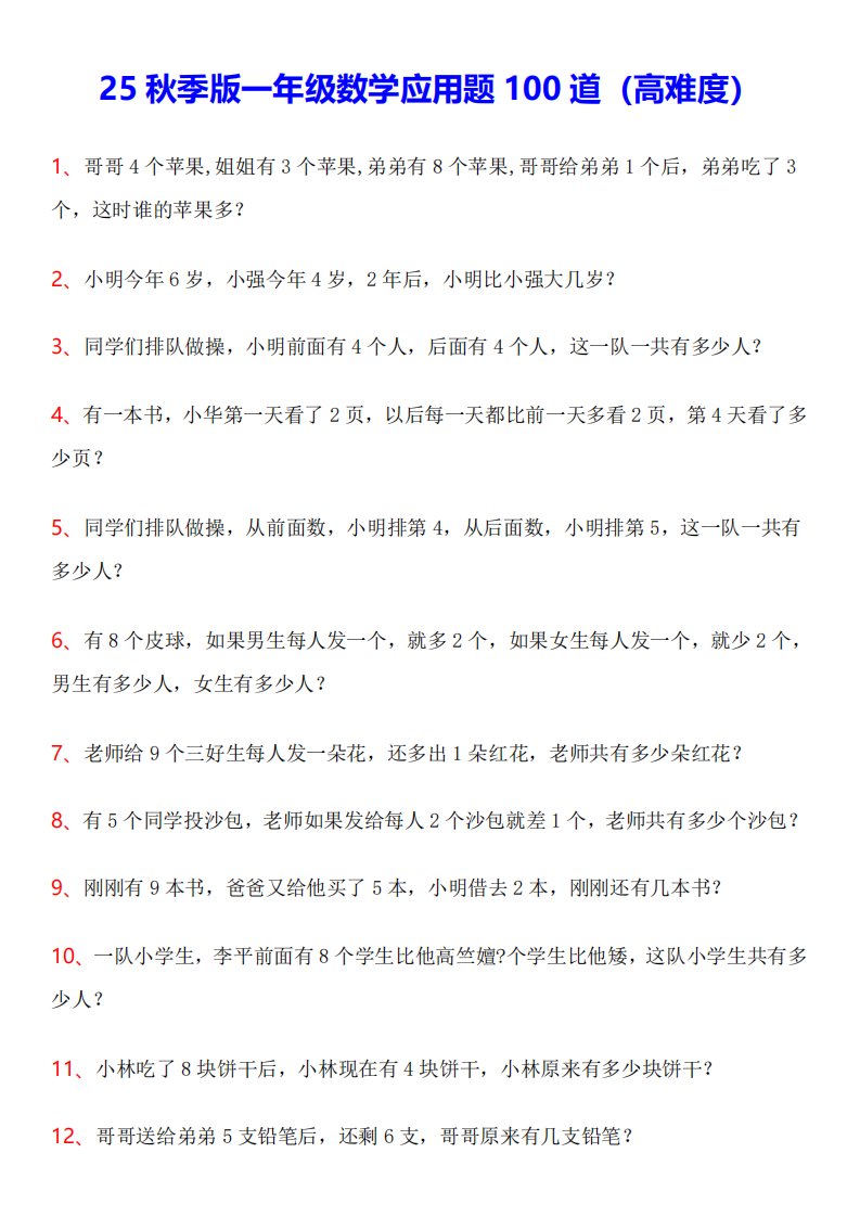 【2025秋新版】一年级数学应用题100道(高难度)-一上数学_共9页