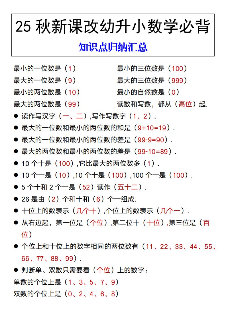 当前位置: 首页小学资源小学一年级正文 【2025秋新版】幼升小数学必背知识点归纳汇总-一上数学_共1页 小学一年级 2 周前 0 0 5 以上为部分内容预览,如需源文档请登录您的会员账号进行下载! 声明:本站所有文章,如无特殊说明或标注,均为本站原创发布。任何个人或组织,在未征得本站同意时,禁止复制、盗用、采集、发布本站内容到任何网站、书籍等各类媒体平台。如若本站内容侵犯了原著者的合法权益,可联系我们进行处理。 尚学资源永久会员 打赏 收藏 海报 链接