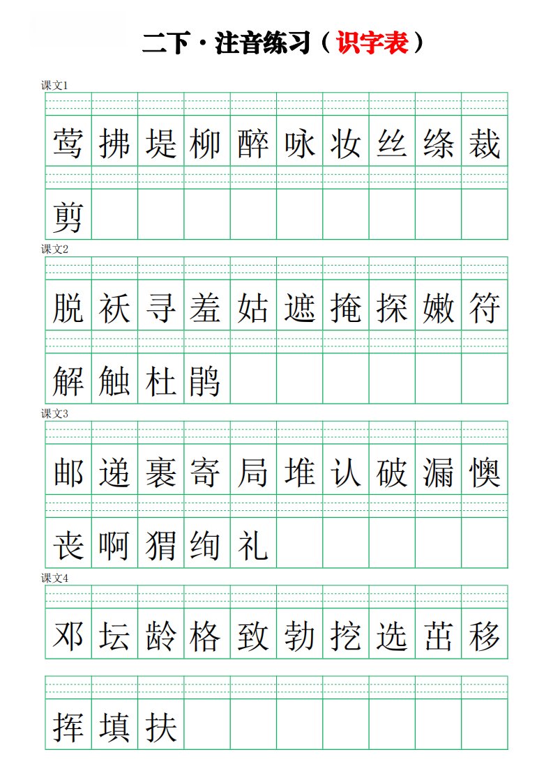 当前位置: 首页小学资源小学二年级正文 二下语文识字表【注音】练习8页_共8页 小学二年级 1 周前 0 0 5 以上为部分内容预览,如需源文档请登录您的会员账号进行下载! 声明:本站所有文章,如无特殊说明或标注,均为本站原创发布。任何个人或组织,在未征得本站同意时,禁止复制、盗用、采集、发布本站内容到任何网站、书籍等各类媒体平台。如若本站内容侵犯了原著者的合法权益,可联系我们进行处理。 尚学资源永久会员 打赏 收藏 海报 链接