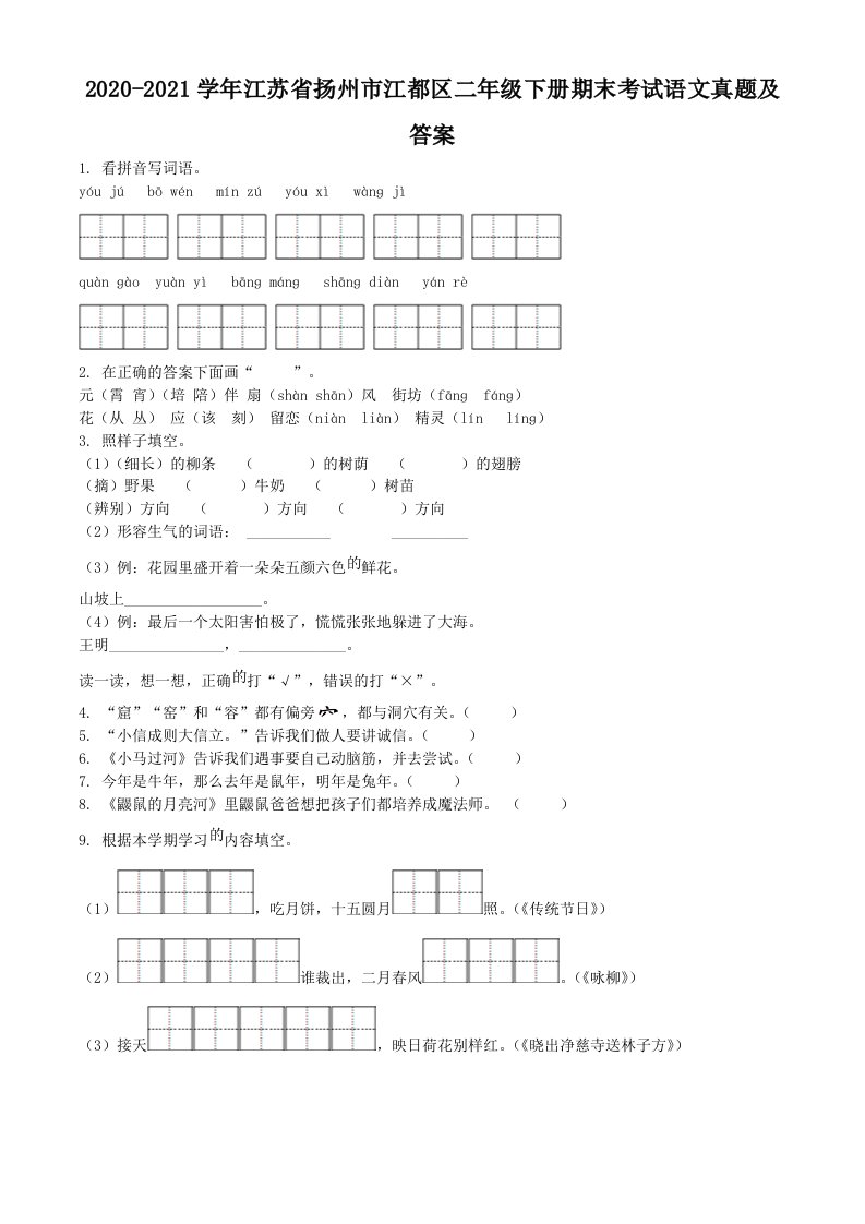 当前位置: 首页小学资源小学二年级正文 2020-2021学年江苏省扬州市江都区二年级下册期末考试语文真题及答案(Word版)_共7页 小学二年级 1 周前 0 0 5 以上为部分内容预览,如需源文档请登录您的会员账号进行下载! 声明:本站所有文章,如无特殊说明或标注,均为本站原创发布。任何个人或组织,在未征得本站同意时,禁止复制、盗用、采集、发布本站内容到任何网站、书籍等各类媒体平台。如若本站内容侵犯了原著者的合法权益,可联系我们进行处理。 尚学资源永久会员 打赏 收藏 海报 链接