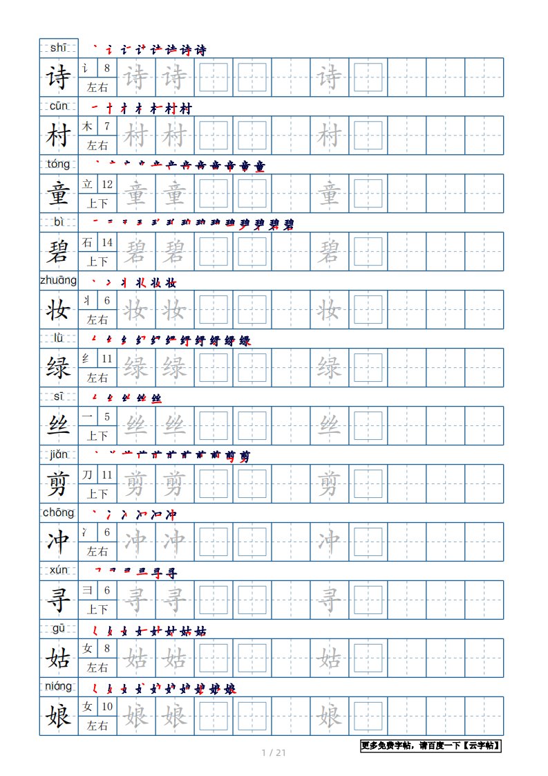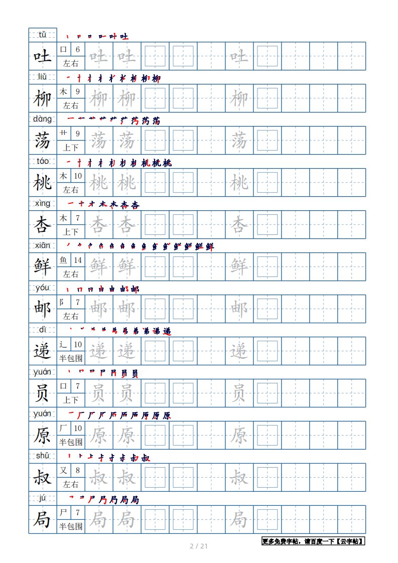 当前位置: 首页小学资源小学二年级正文 二年级语文下册【2022年更新】生字表250个,字帖21页(带偏旁部首、笔顺,拼音)(统编版)_共21页 小学二年级 1 周前 0 0 15 以上为部分内容预览,如需源文档请登录您的会员账号进行下载! 声明:本站所有文章,如无特殊说明或标注,均为本站原创发布。任何个人或组织,在未征得本站同意时,禁止复制、盗用、采集、发布本站内容到任何网站、书籍等各类媒体平台。如若本站内容侵犯了原著者的合法权益,可联系我们进行处理。 尚学资源永久会员 打赏 收藏 海报 链接