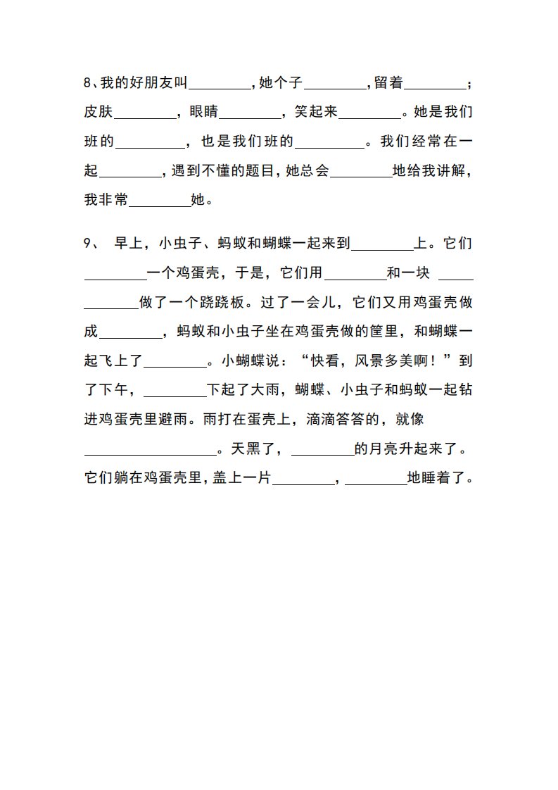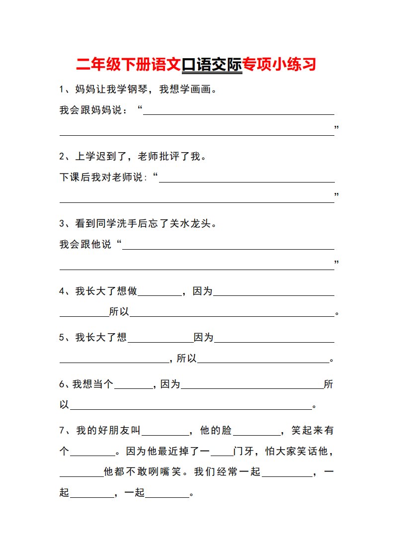 当前位置: 首页小学资源小学二年级正文 二年级下册语文口语交际专项小练习_共3页 小学二年级 1 周前 0 0 5 以上为部分内容预览,如需源文档请登录您的会员账号进行下载! 声明:本站所有文章,如无特殊说明或标注,均为本站原创发布。任何个人或组织,在未征得本站同意时,禁止复制、盗用、采集、发布本站内容到任何网站、书籍等各类媒体平台。如若本站内容侵犯了原著者的合法权益,可联系我们进行处理。 尚学资源永久会员 打赏 收藏 海报 链接