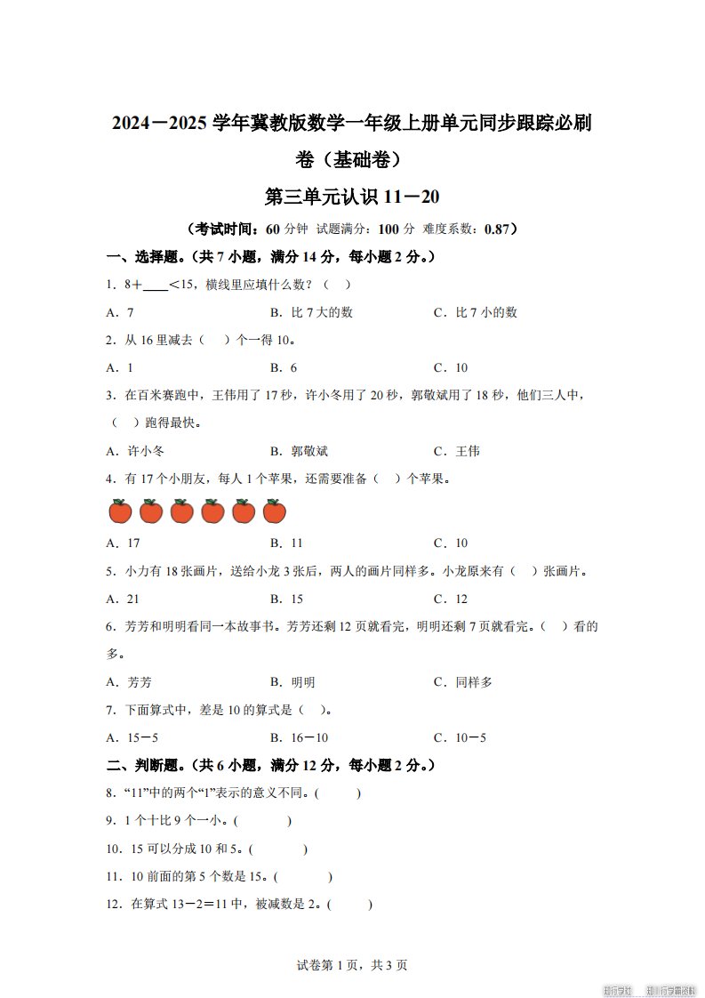 当前位置: 首页小学资源小学一年级正文 冀教版数学一年级上册第三单元《认识11-20》单元测试卷(基础卷)_共10页 小学一年级 2 周前 0 0 5 以上为部分内容预览,如需源文档请登录您的会员账号进行下载! 声明:本站所有文章,如无特殊说明或标注,均为本站原创发布。任何个人或组织,在未征得本站同意时,禁止复制、盗用、采集、发布本站内容到任何网站、书籍等各类媒体平台。如若本站内容侵犯了原著者的合法权益,可联系我们进行处理。 尚学资源永久会员 打赏 收藏 海报 链接